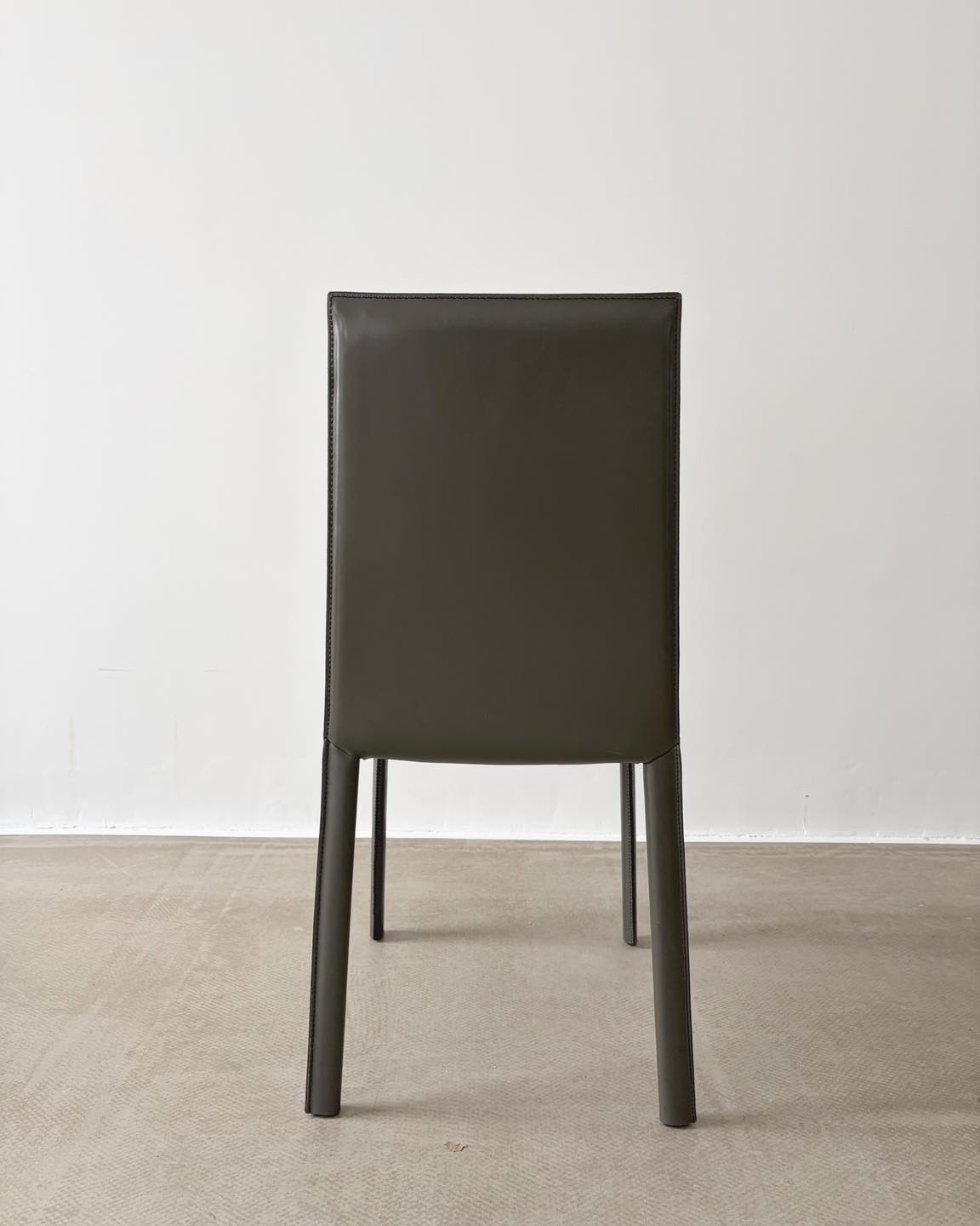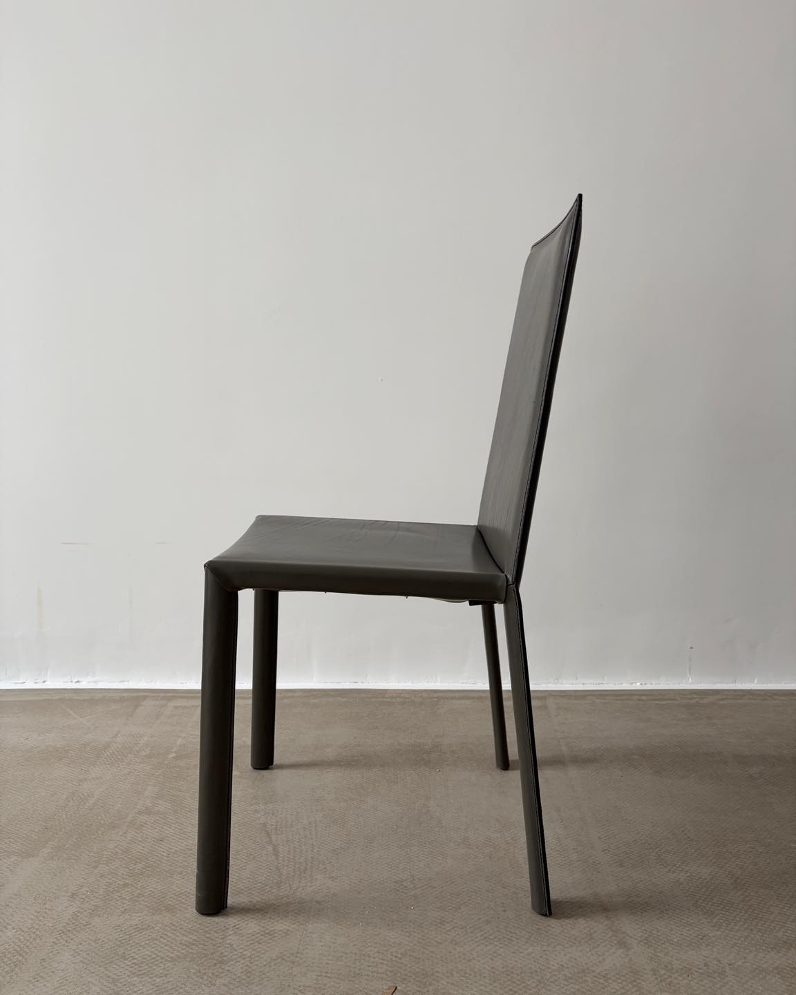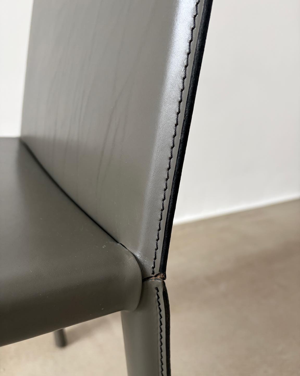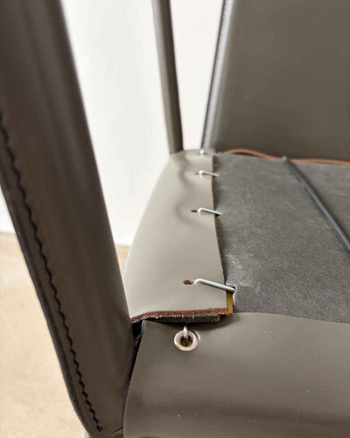 Krzesło włoskiej marki ARRBEN. Wykonane z grubej skóry siodłowej barwionej na kolor Ash, nieoczywistego odcienia szarości.