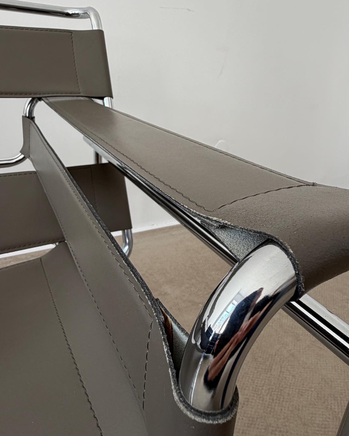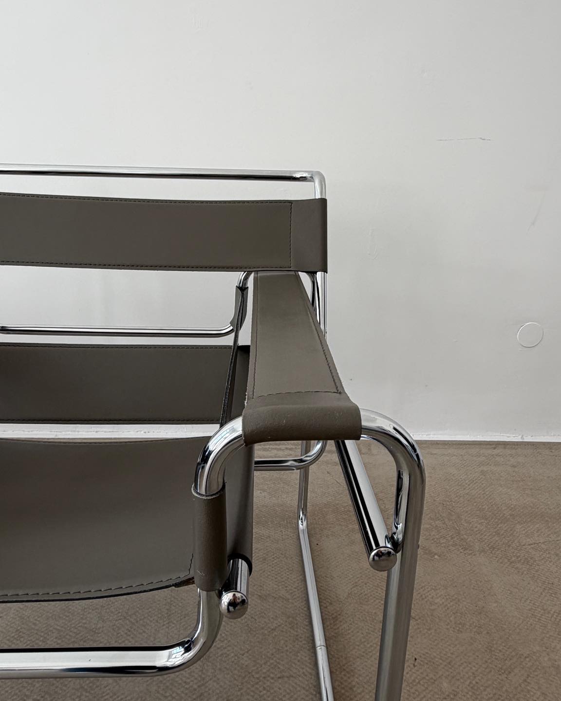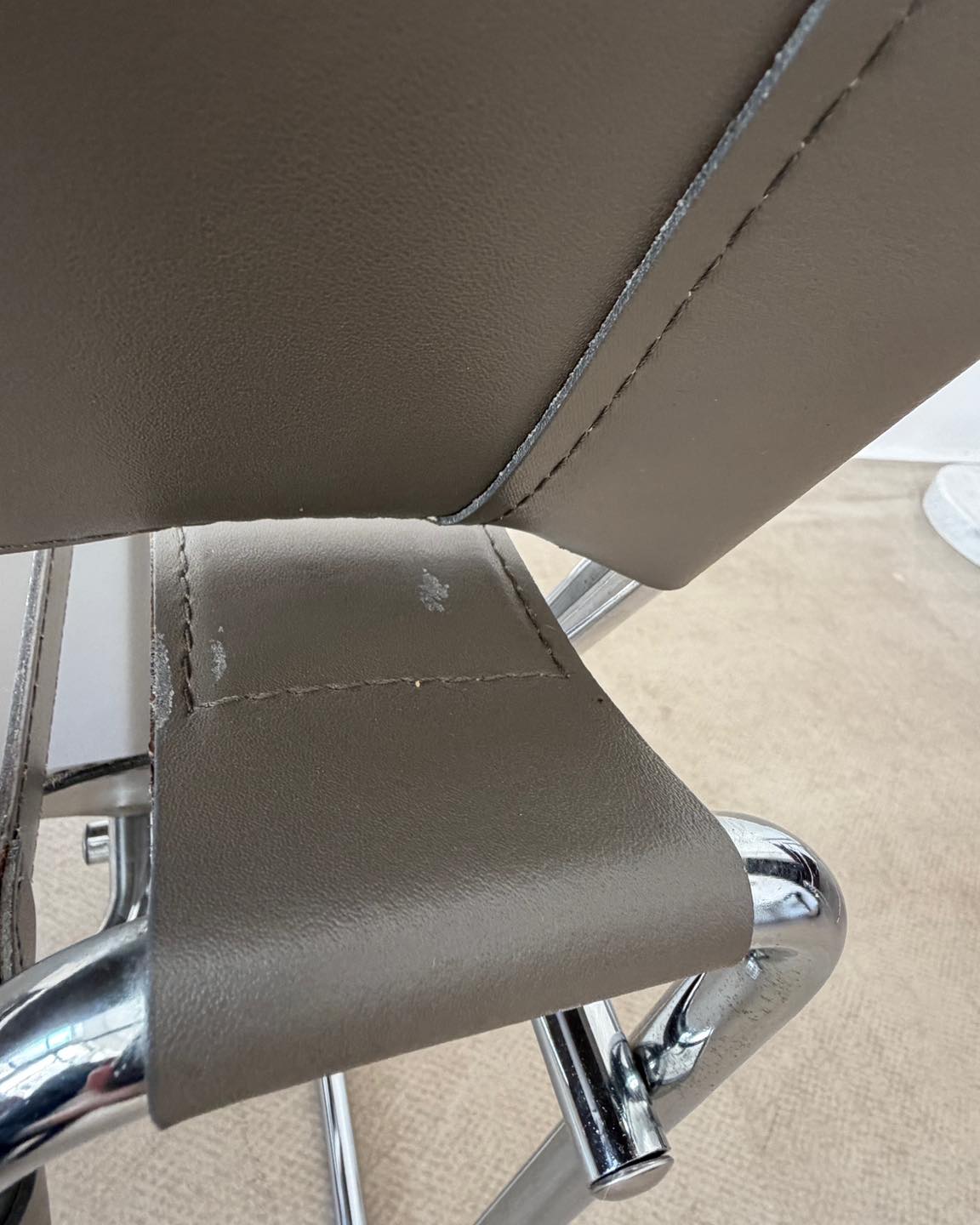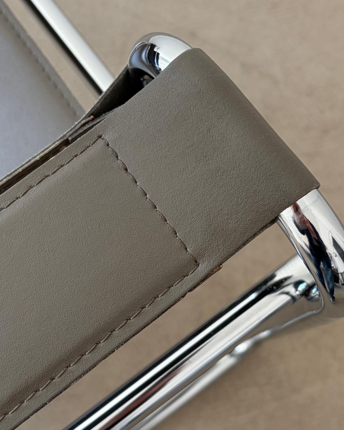 Materiały: skóra naturalna w kolorze szarym z nutą beżu, konstrukcja z chromowanej rurki.