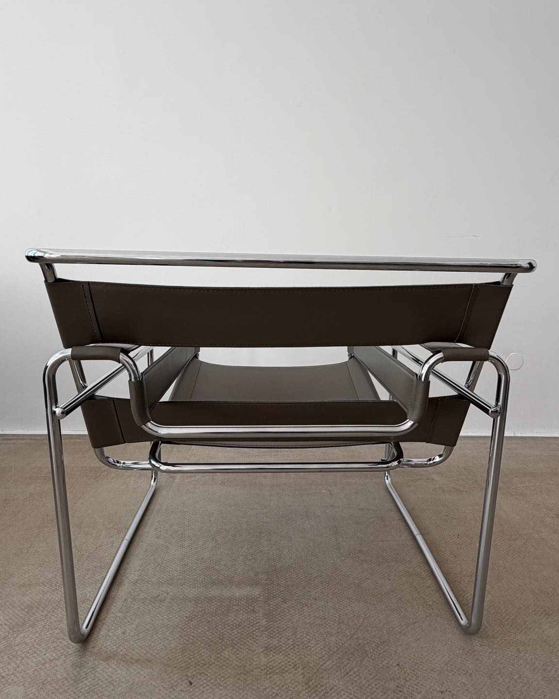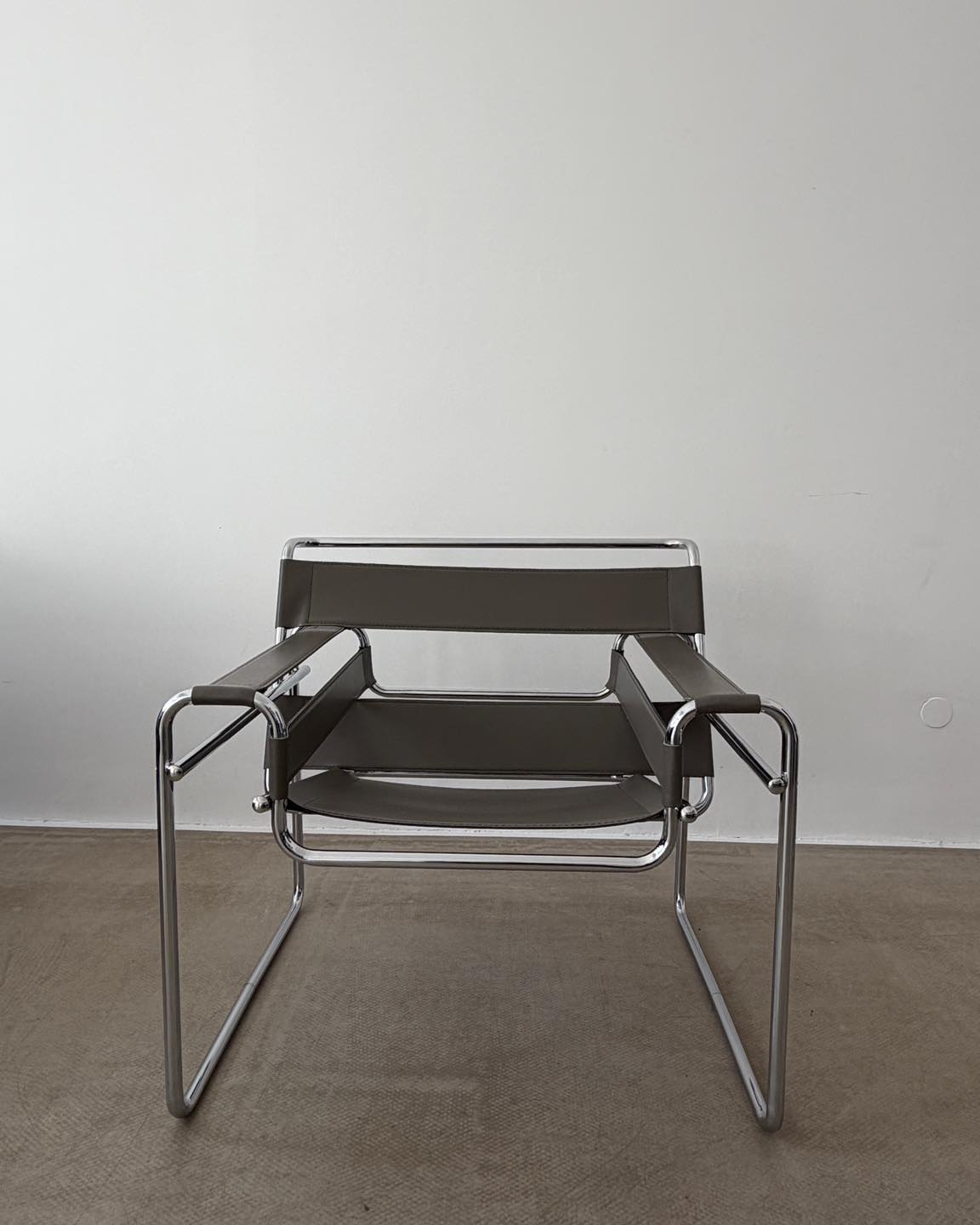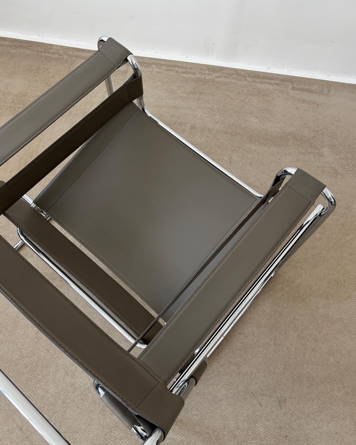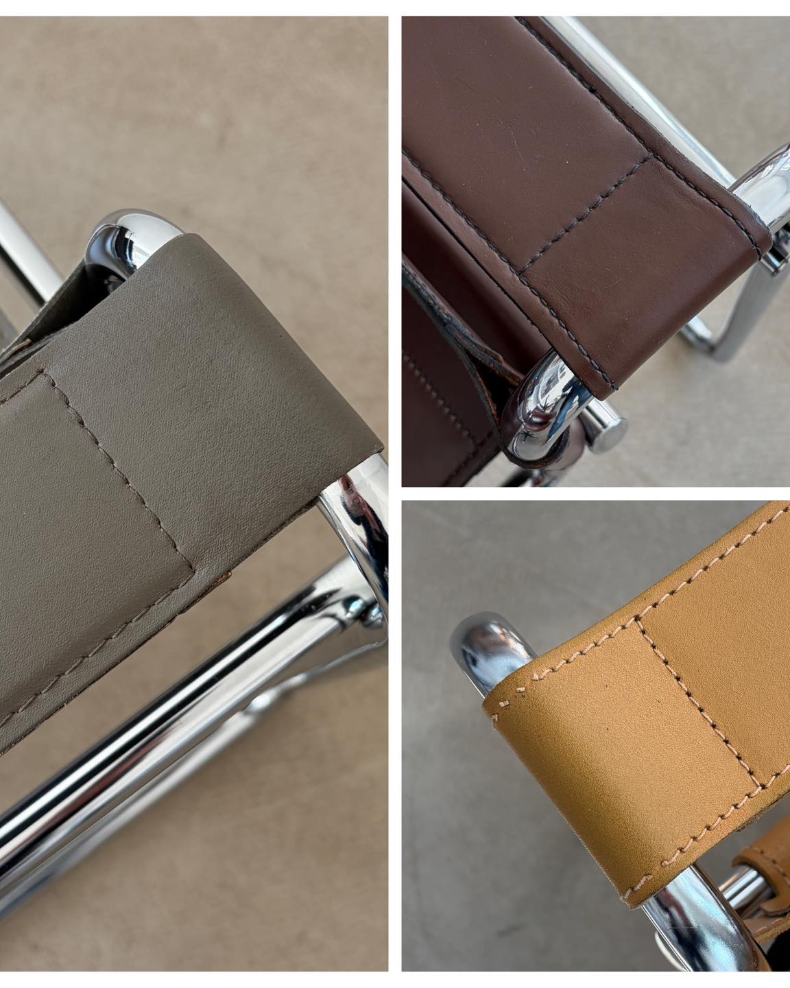 Materiały: skóra naturalna w kolorze szarym z nutą beżu, konstrukcja z chromowanej rurki.