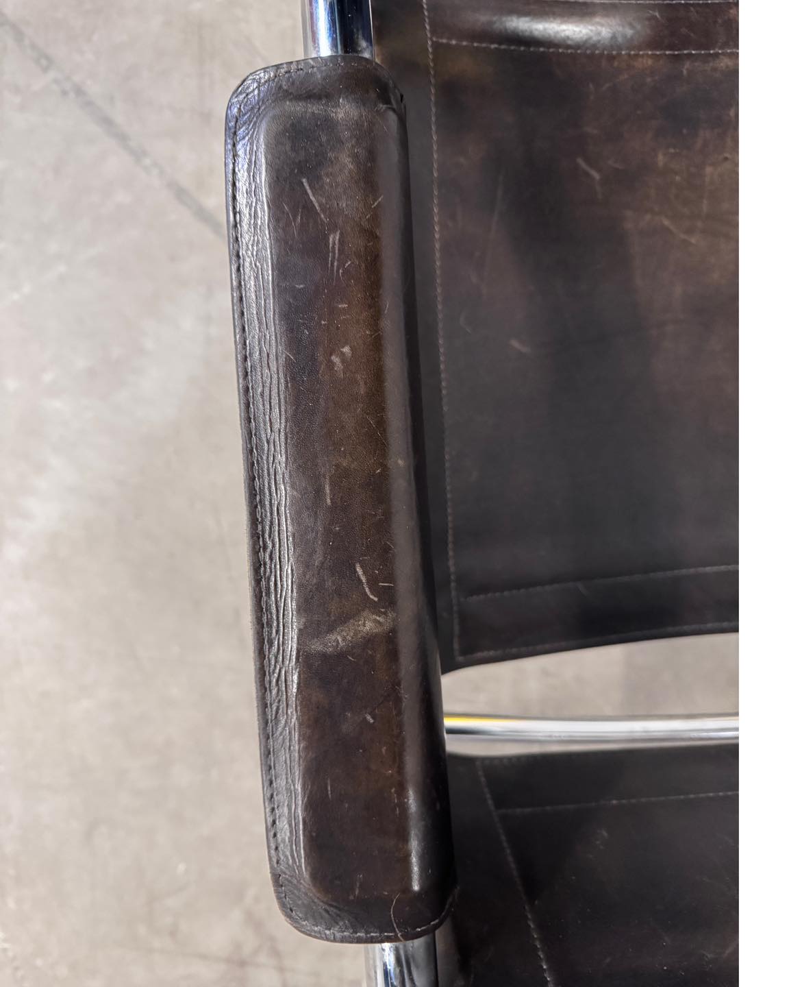 Materiały: chromowana metalowa konstrukcja, skóra naturalna licowa w kolorze brązowym