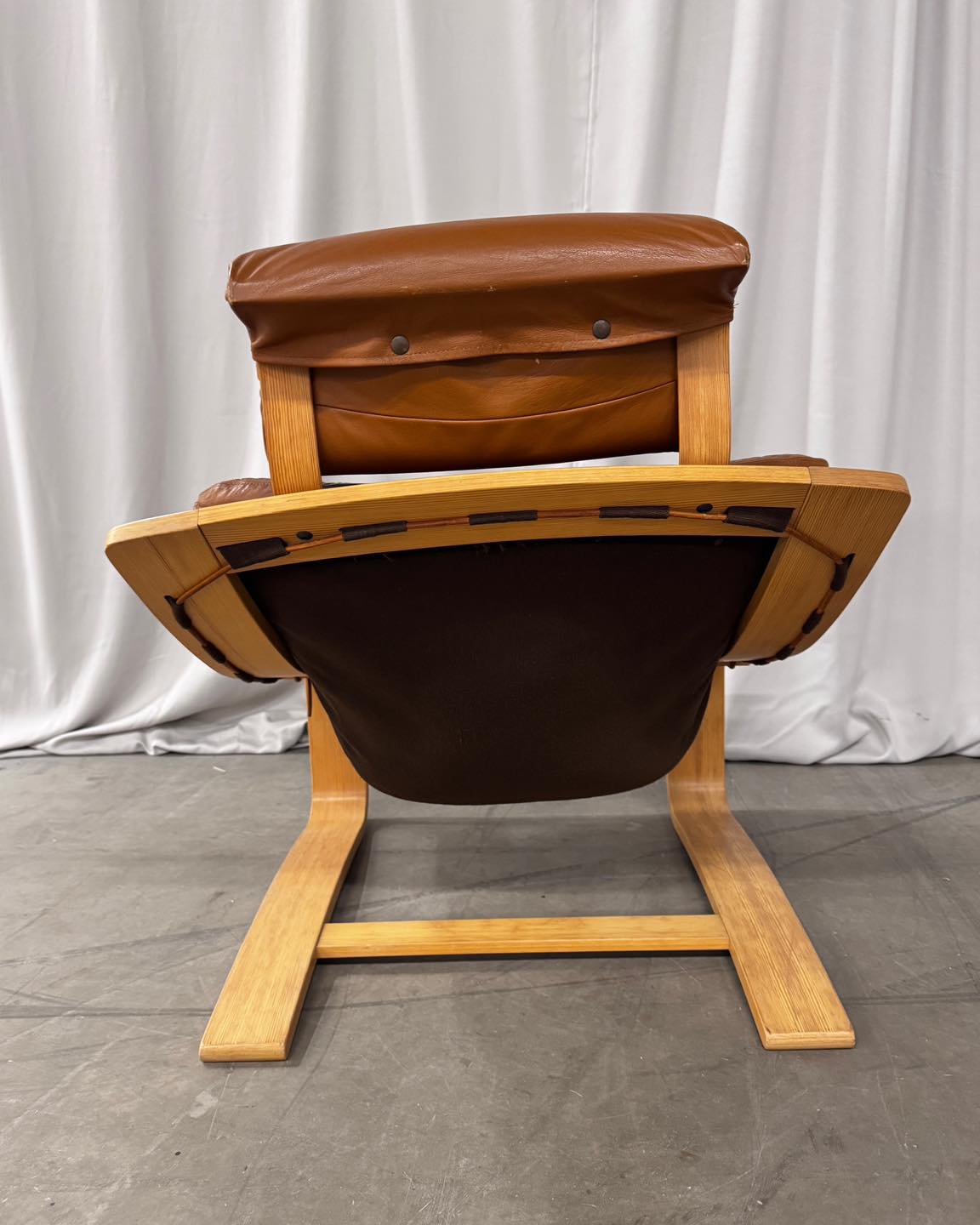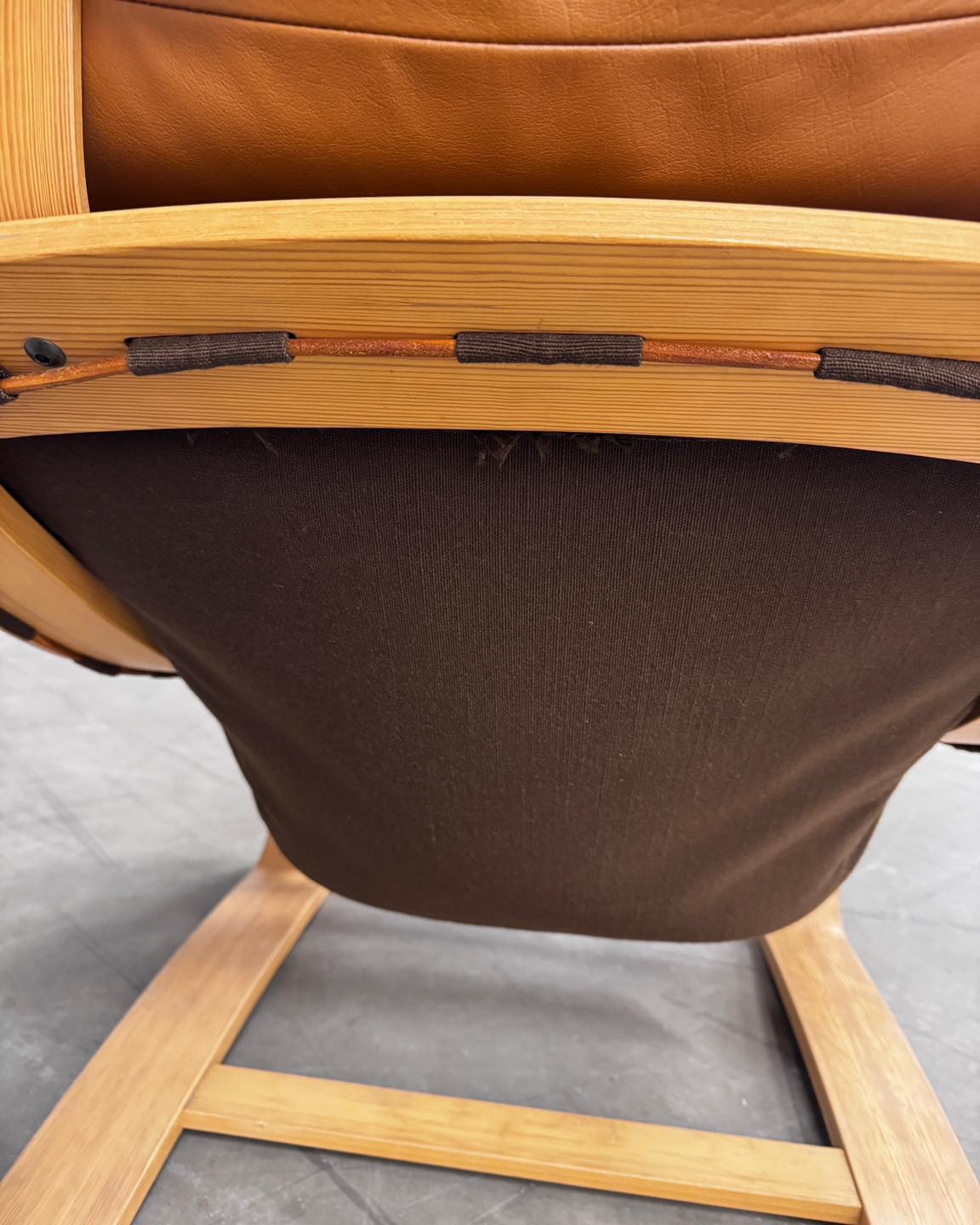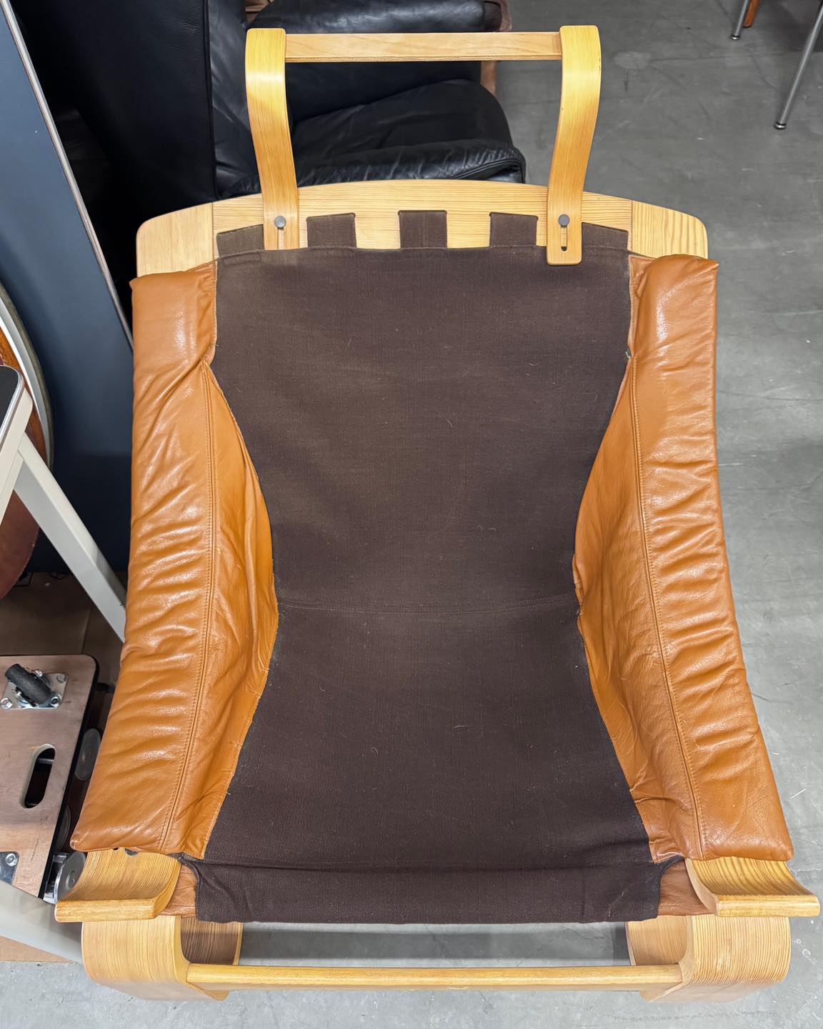 Materiały: gięta sklejka, skóra naturalna, rzemień, płótno bawełniane.
