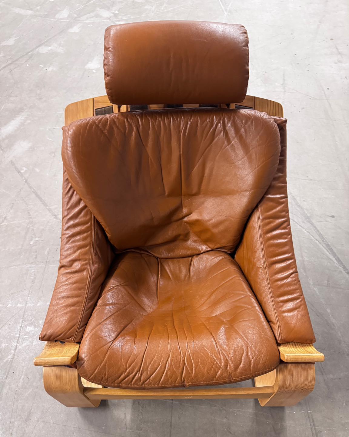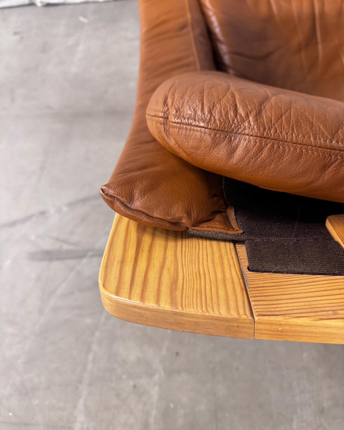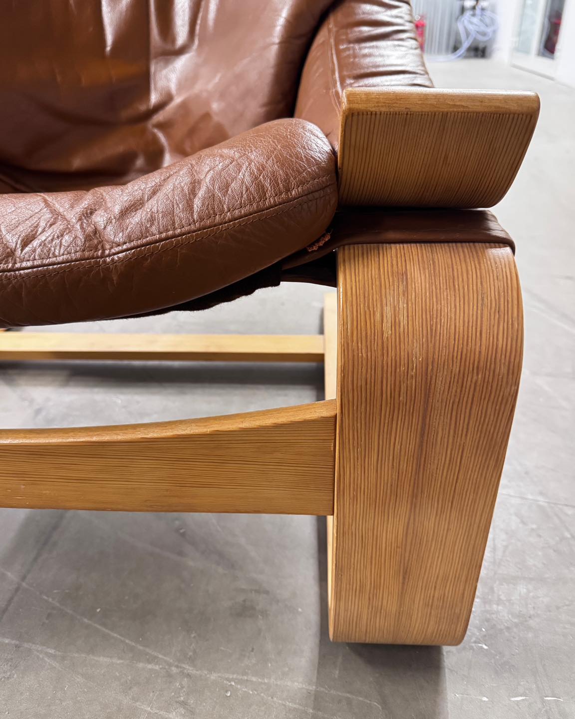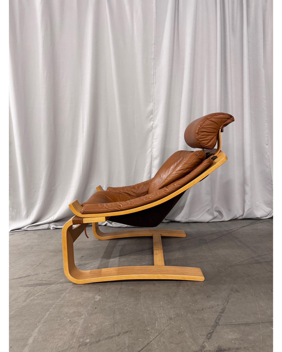 Materiały: gięta sklejka, skóra naturalna, rzemień, płótno bawełniane.