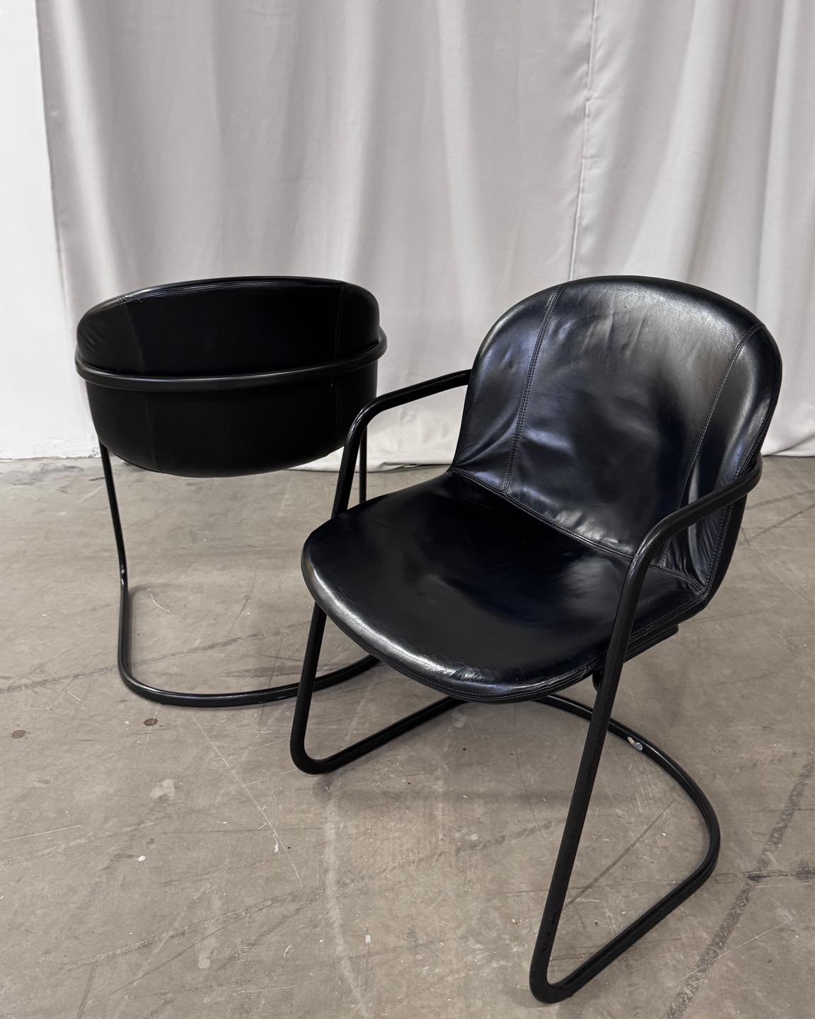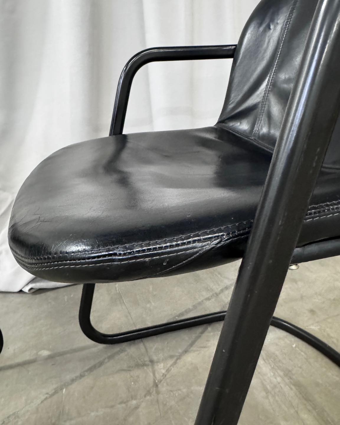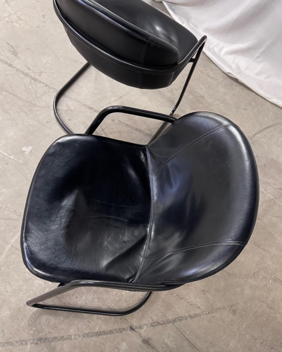 Materiały: stal malowana na czarno, tapicerka z czarnej skóry naturalnej.