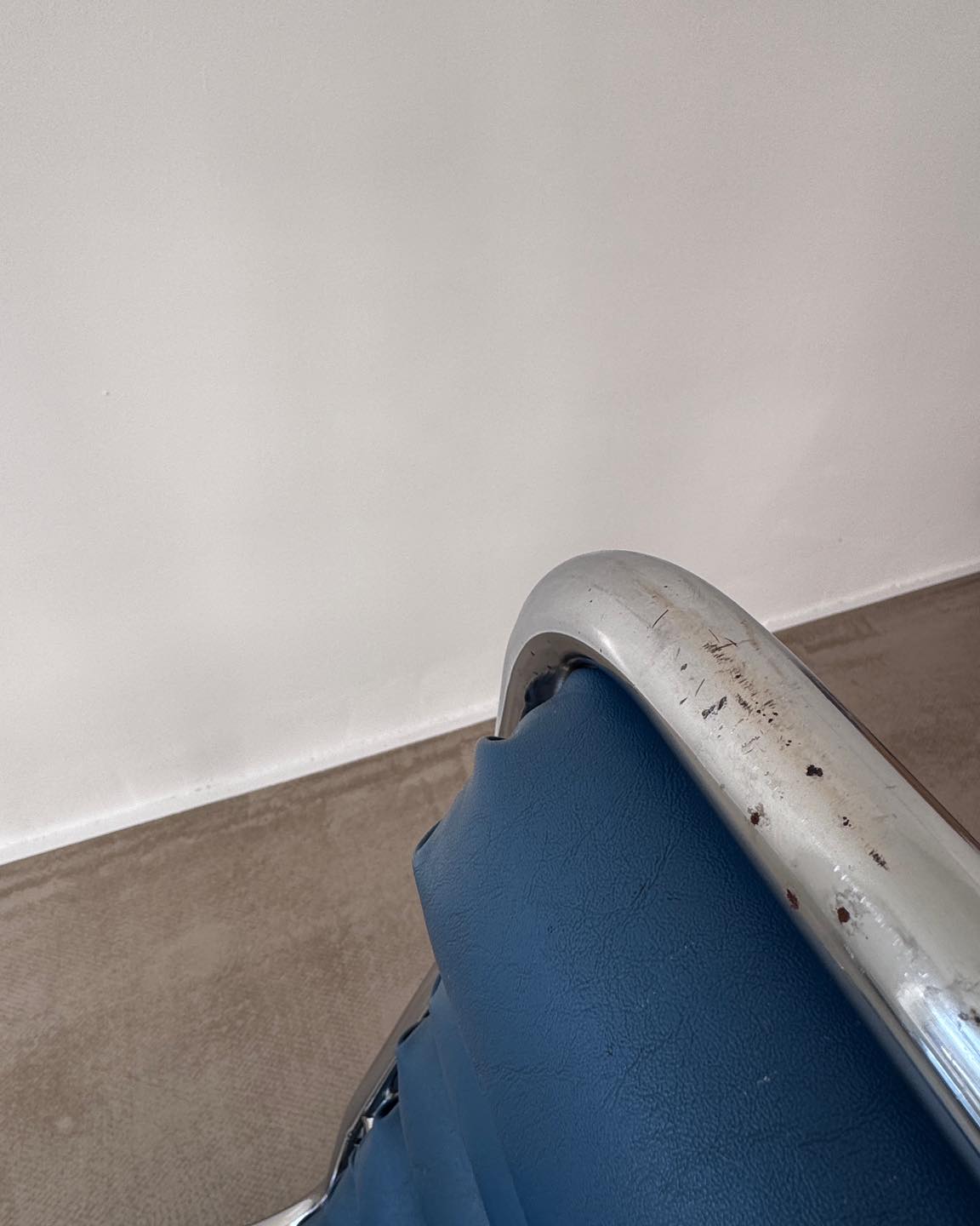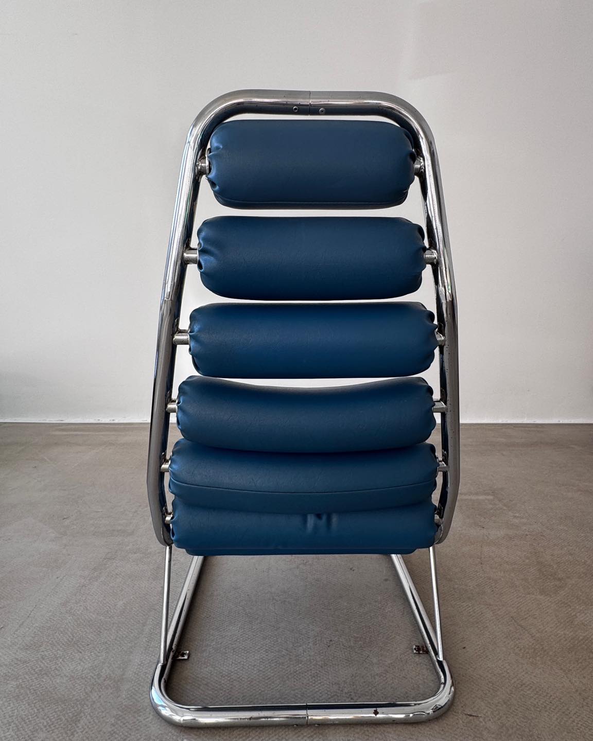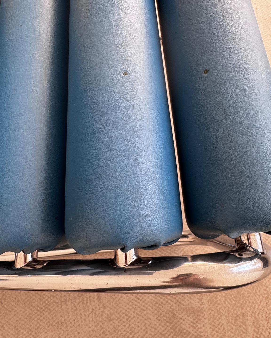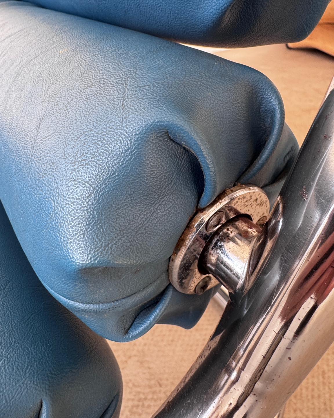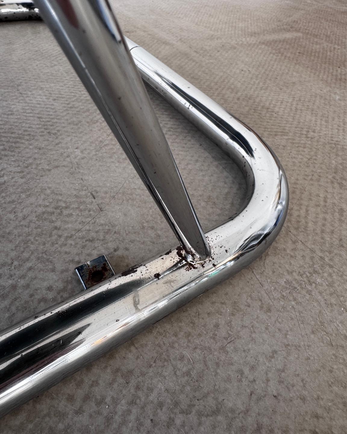 Stan: dostateczny. Liczne ubytki w powłoce chromu, z nalotem rdzy. Tapicerka ze śladami intensywnego użytkowania. Wszystkie niedoskonałości zobrazowane na zdjęciach.