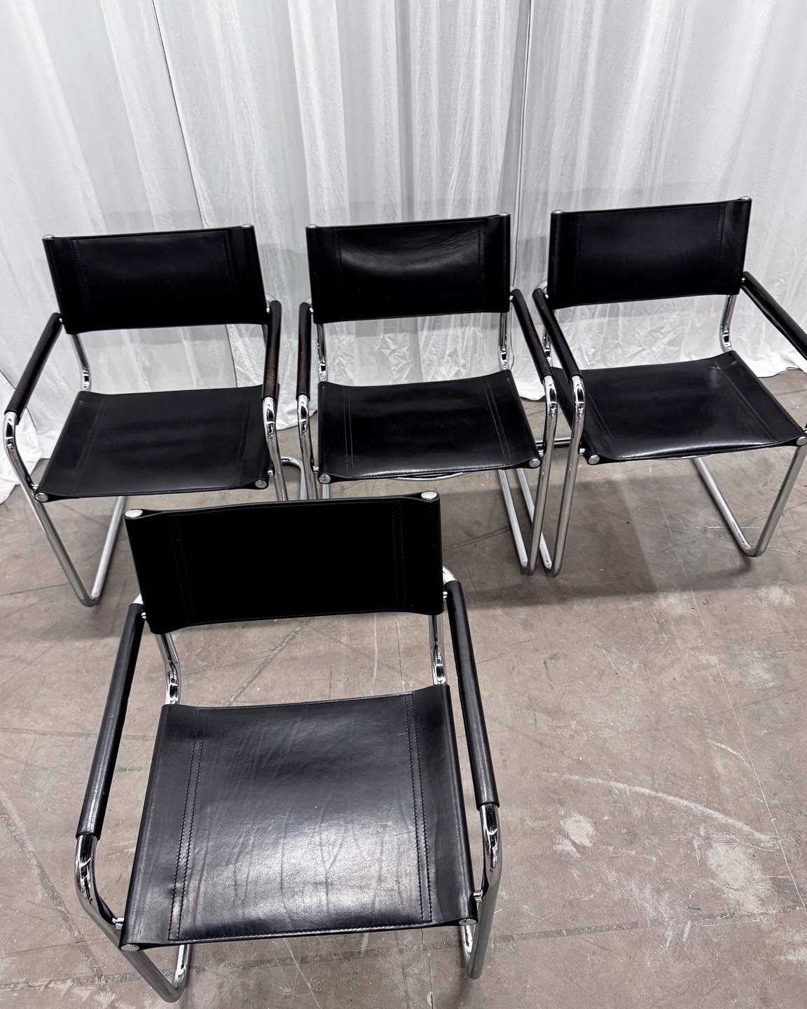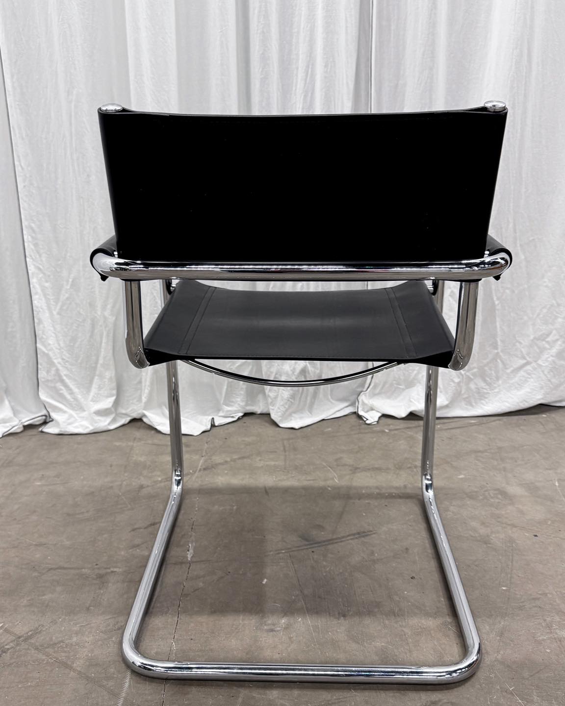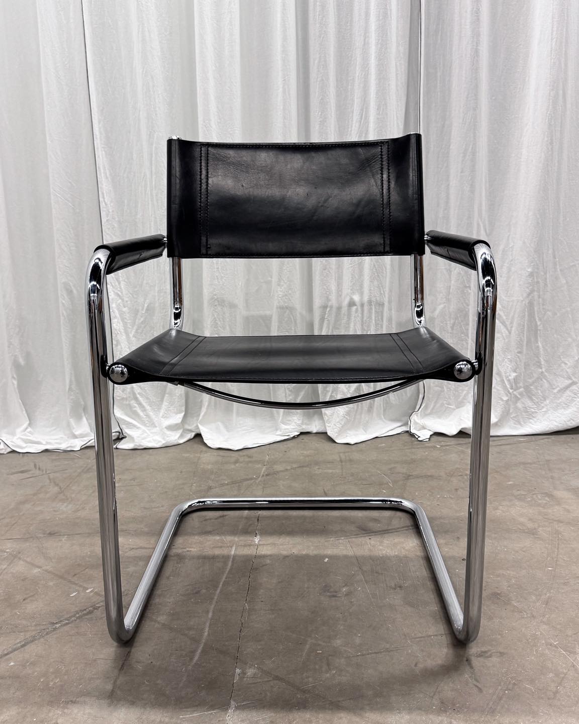 Krzesła wspornikowe ze skóry w kolorze czarnym. Projekt - Mart Stam / Marcel Breuer w latach 20