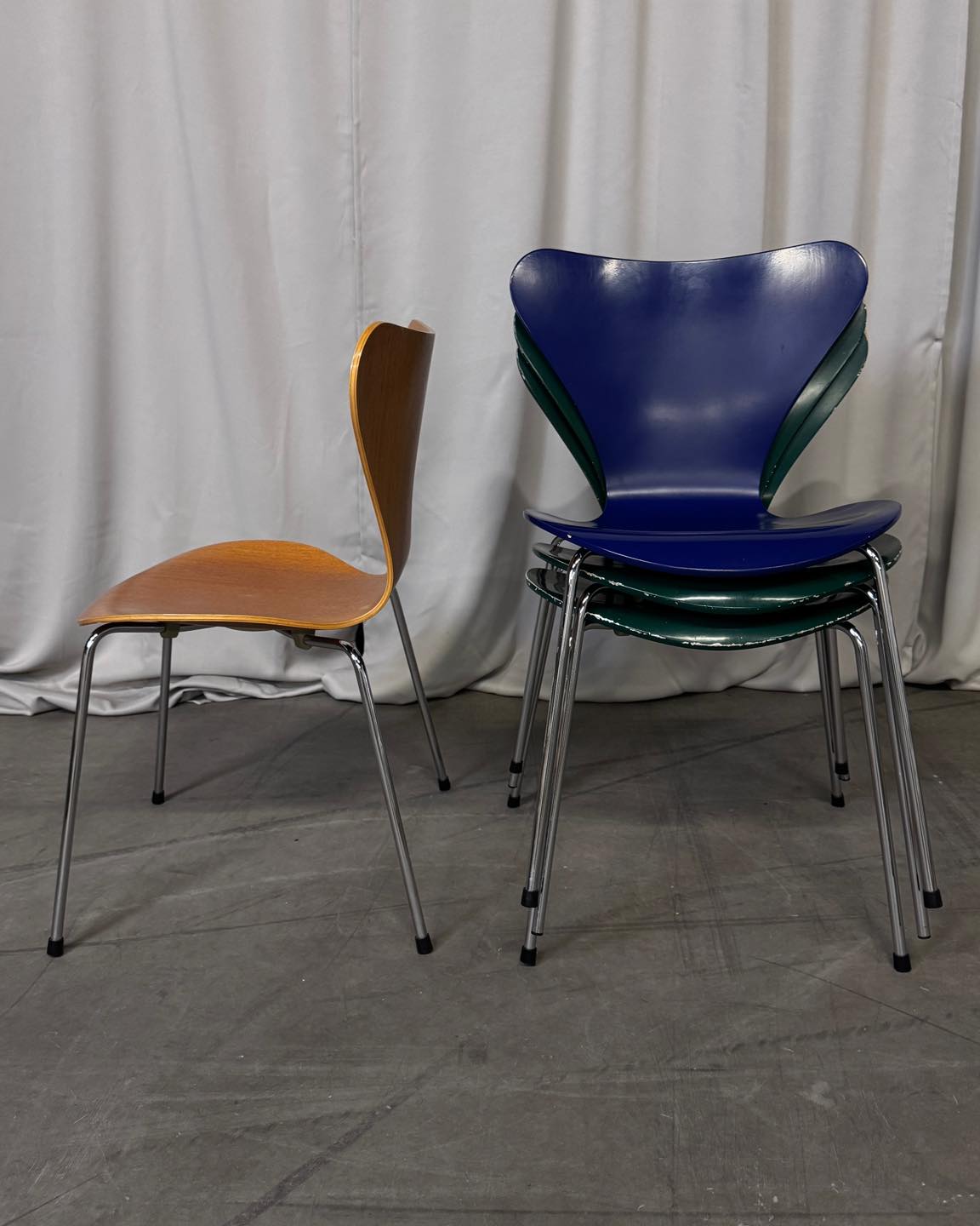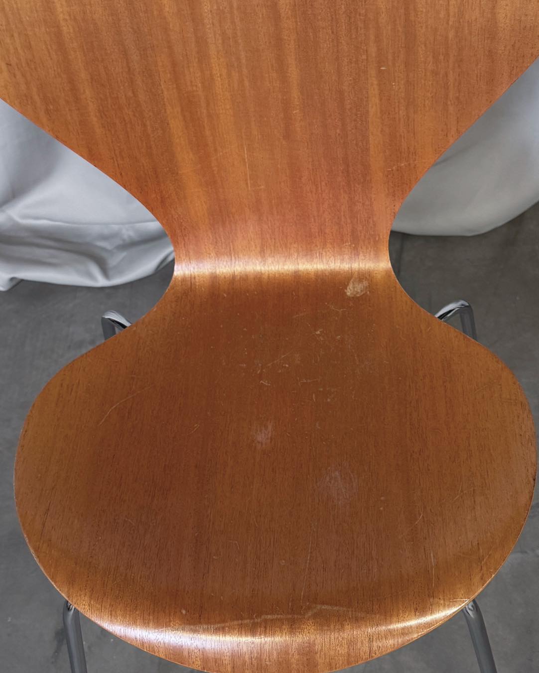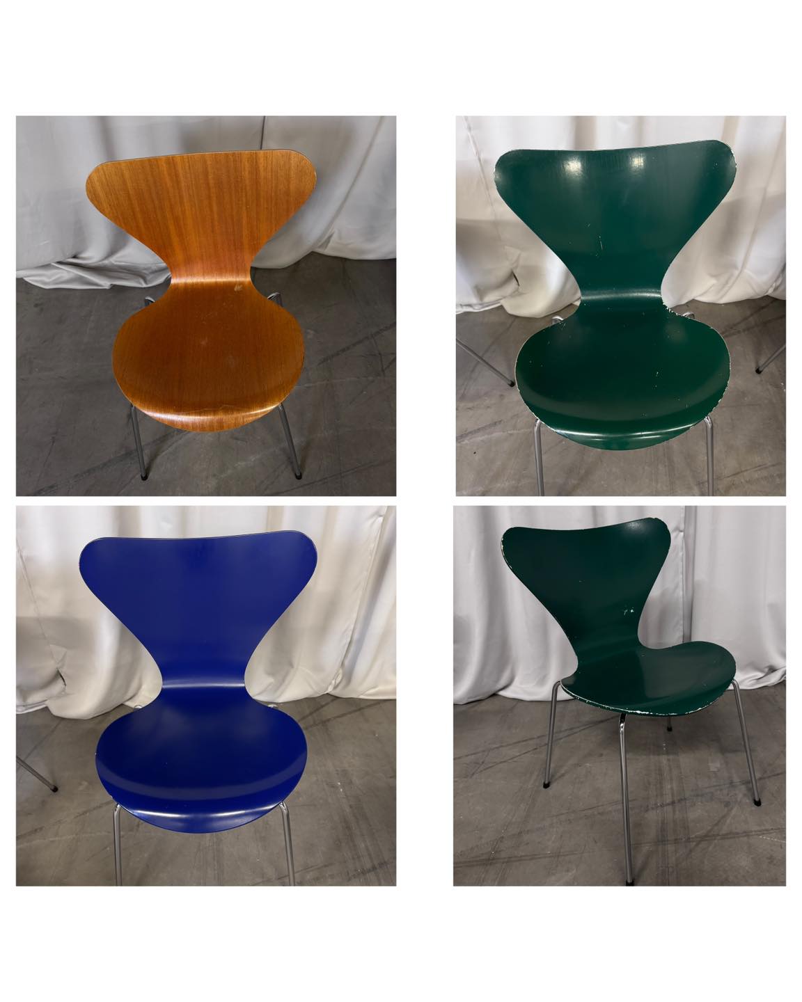 Stan: stan 2 najstarszych adekwatny do wieku, obicia siedziska, zadrapania farby, w jednym brakuje plastikowej pokrywy osłaniającej łączenie siedziska z nogami (niewidoczne, bo miejsce jest pod siedziskiem). Plastikowe stopki obu egzemplarzy różnią się, są dość zużyte. Krzesło niebieskie posiada nieznaczne ślady użytkowania w postaci zadrapania farby w 2 miejscach. Krzesło w kolorze naturalnym posiada zarysowania siedziska i zmatowienia widoczne na zdjęciu.