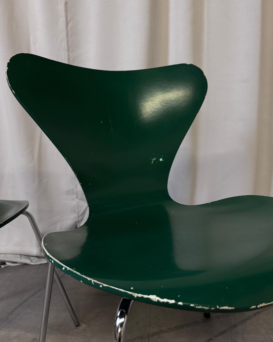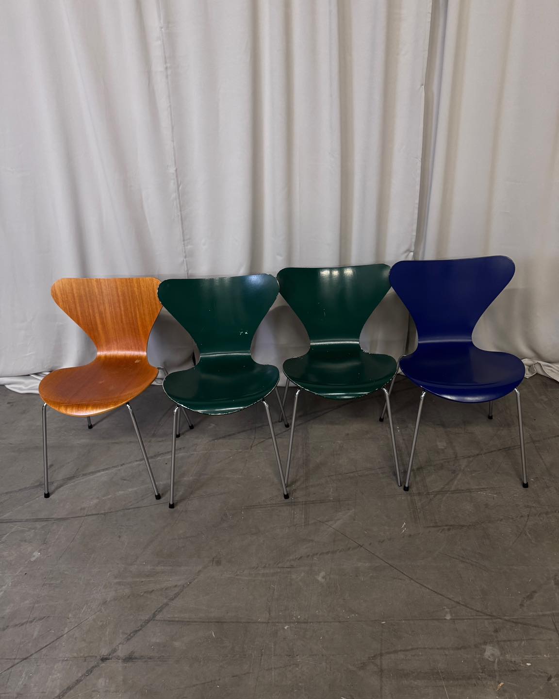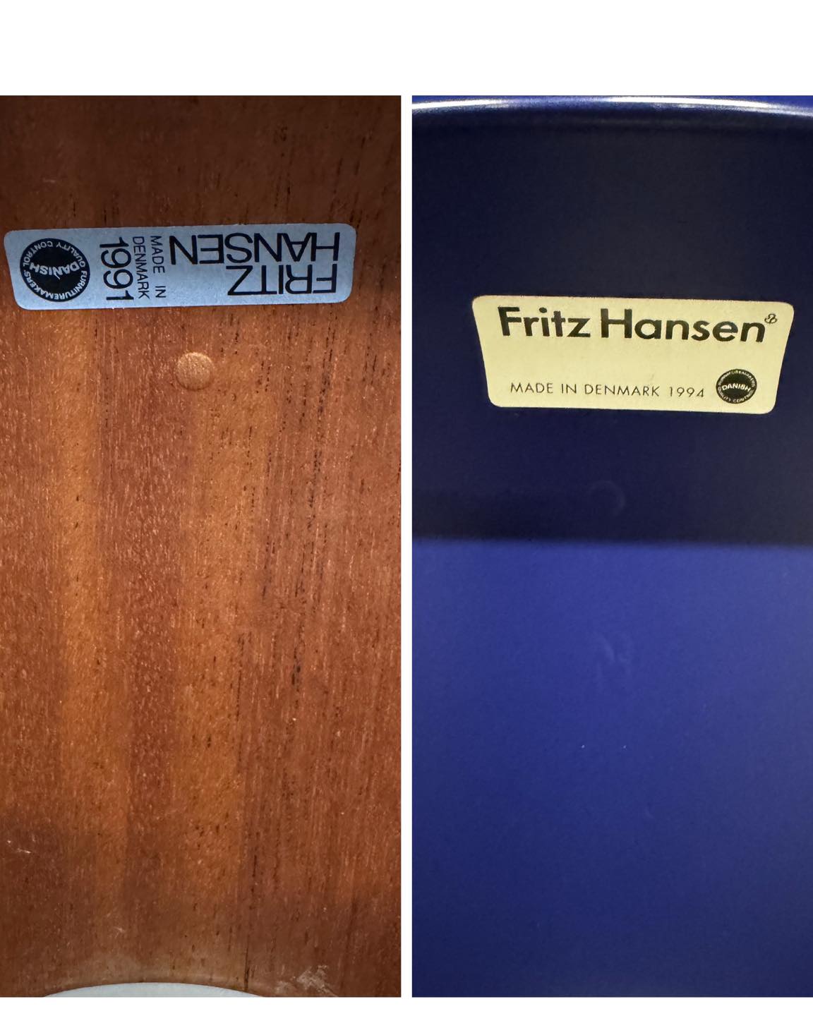 Stan: stan 2 najstarszych adekwatny do wieku, obicia siedziska, zadrapania farby, w jednym brakuje plastikowej pokrywy osłaniającej łączenie siedziska z nogami (niewidoczne, bo miejsce jest pod siedziskiem). Plastikowe stopki obu egzemplarzy różnią się, są dość zużyte. Krzesło niebieskie posiada nieznaczne ślady użytkowania w postaci zadrapania farby w 2 miejscach. Krzesło w kolorze naturalnym posiada zarysowania siedziska i zmatowienia widoczne na zdjęciu.