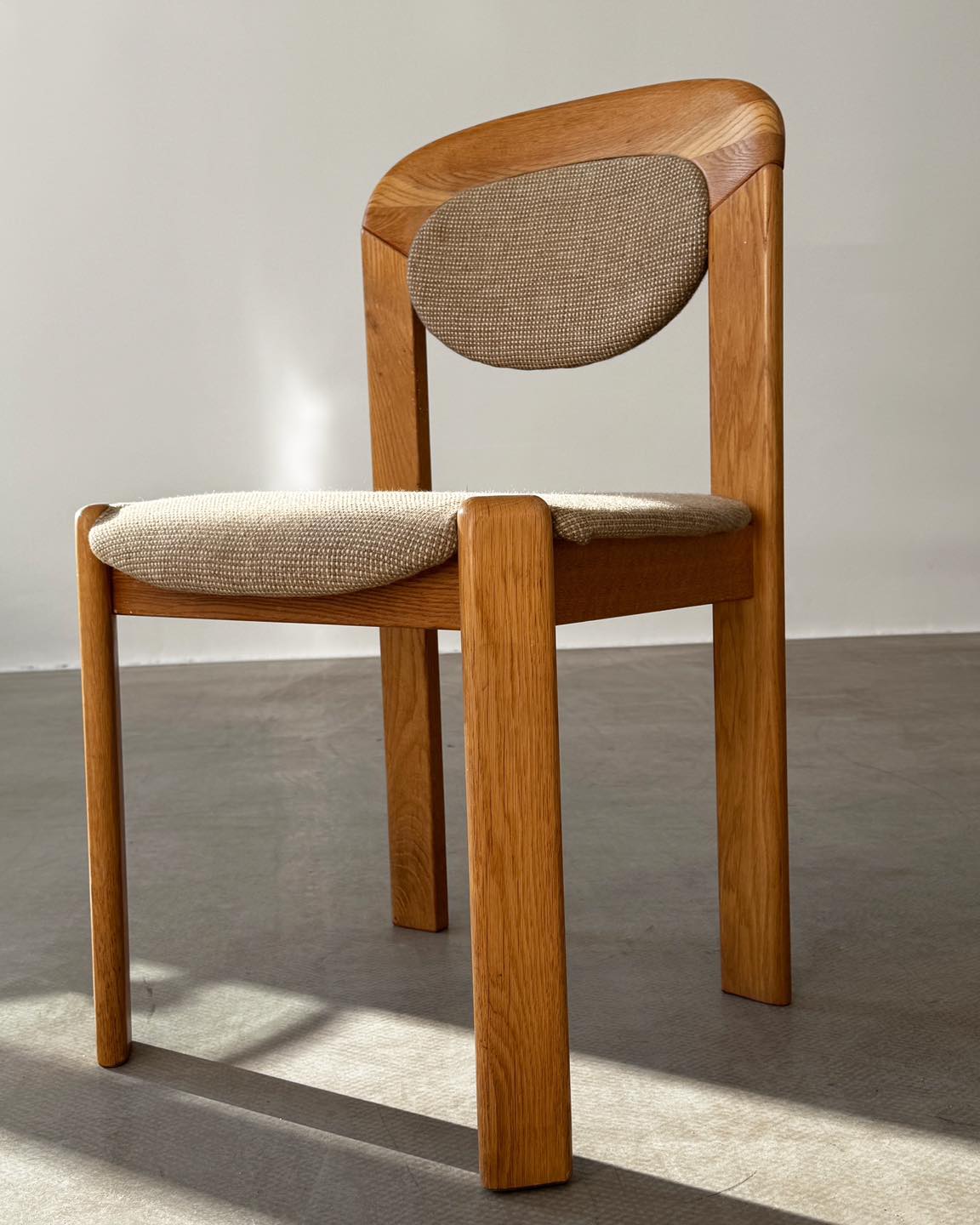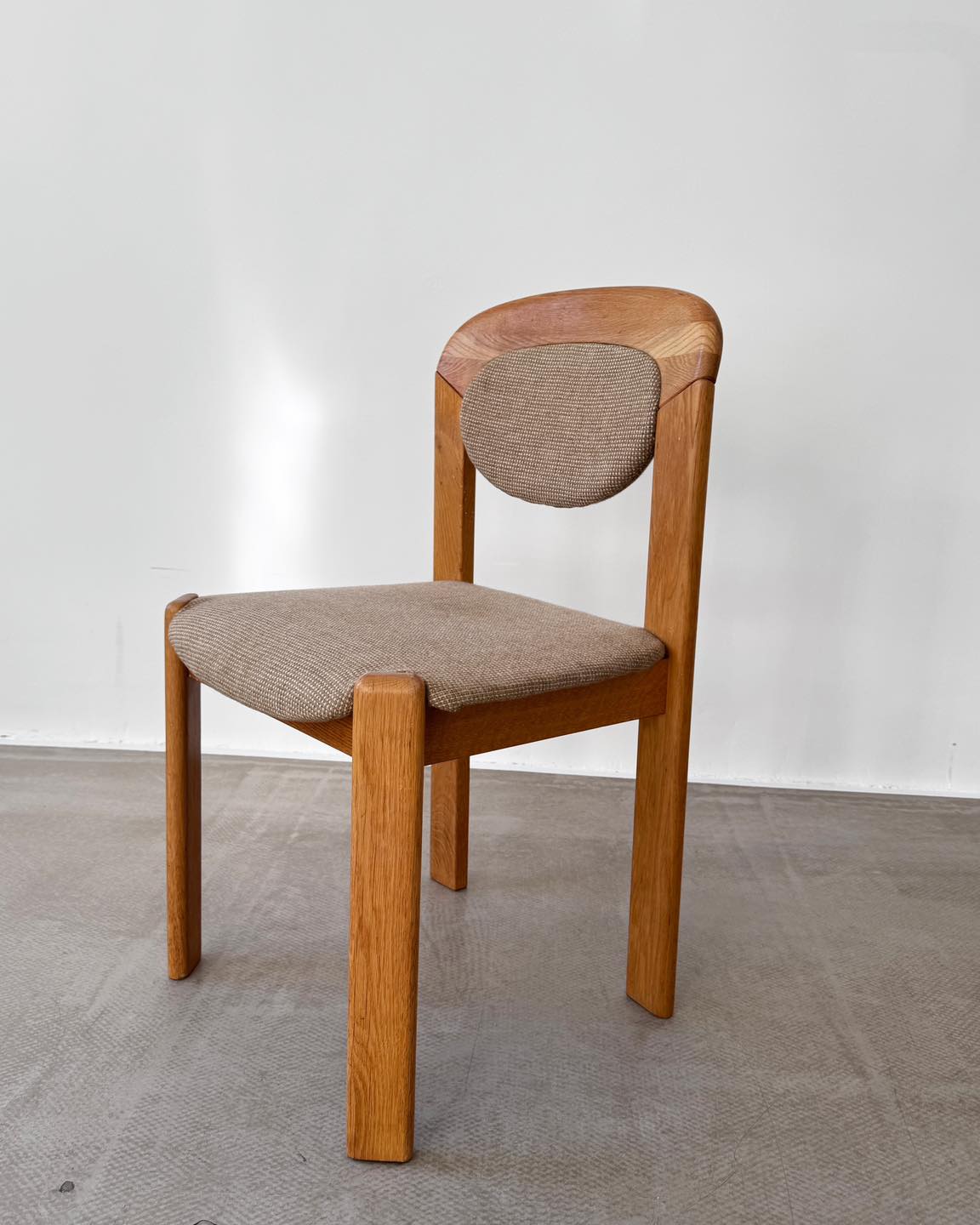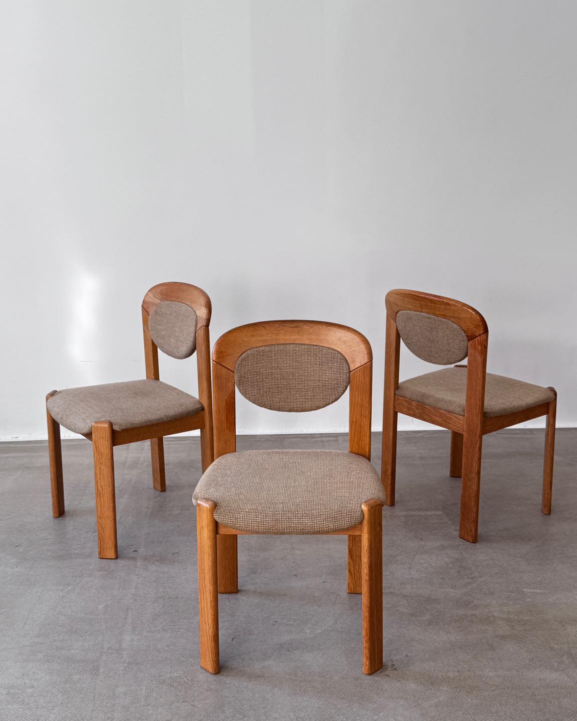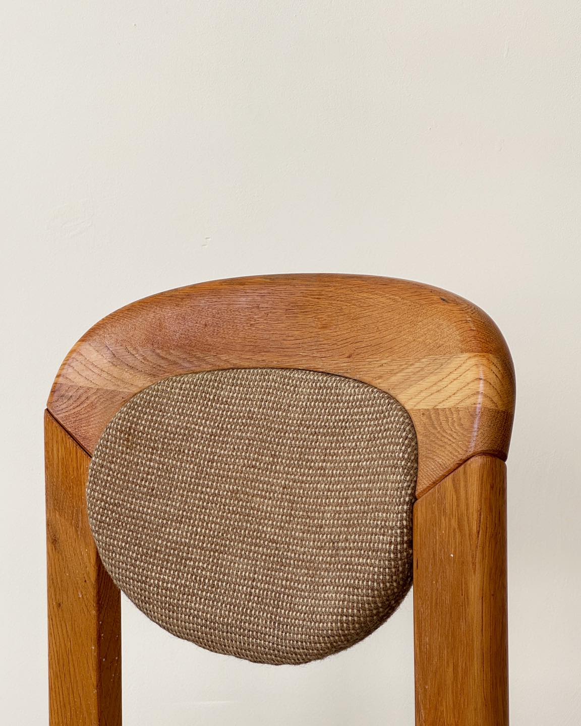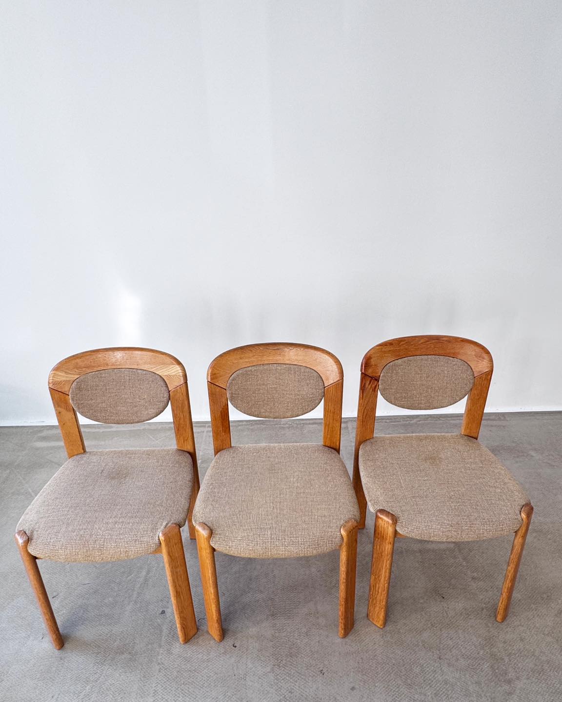 Krzesła dębowe z tapicerowanymi elementami. Forma nawiązująca do projektu Bruno Reya. Producent i data produkcji nieznane.