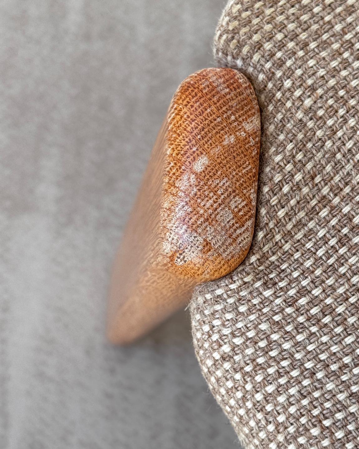 Stan: dobry vintage. Konstrukcyjnie bez zarzutu, miejscowo ubytki w lakierze. Na ramie 2 krzeseł widoczne ciemniejsze miejsca.
