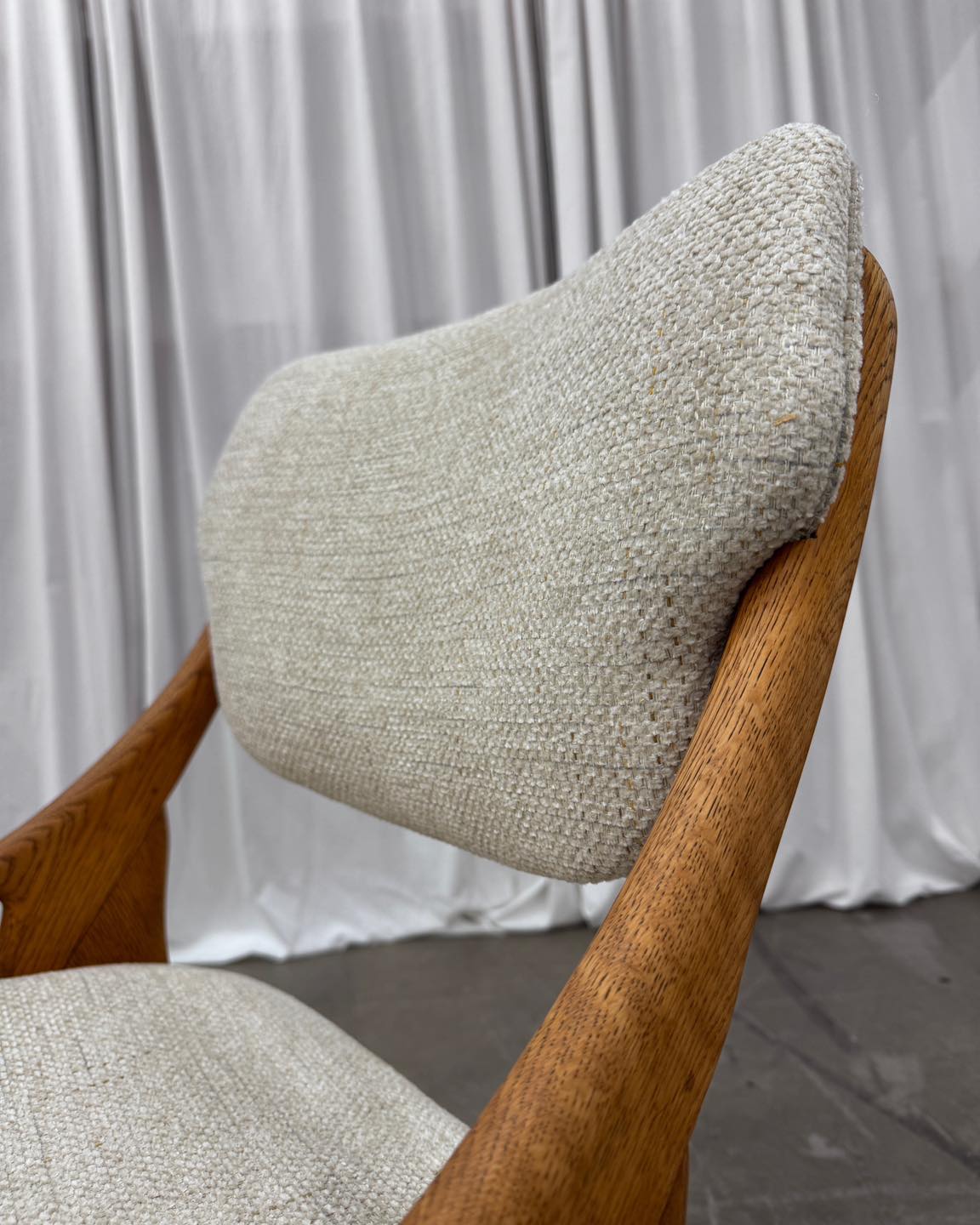 Hovmand Olsen dla duńskiej marki Mogens Kold. Lata 50./60. Standardowa wysokość siedziska, co pozwala na użytkowanie zarówno przy stole, jak i przy biurku. Przepiękna rzeźbiona forma. Egzemplarz po renowacji tapicerskiej. Posiadamy jeszcze 3 sztuki w oryginalnej tkaninie. Lata 50./60