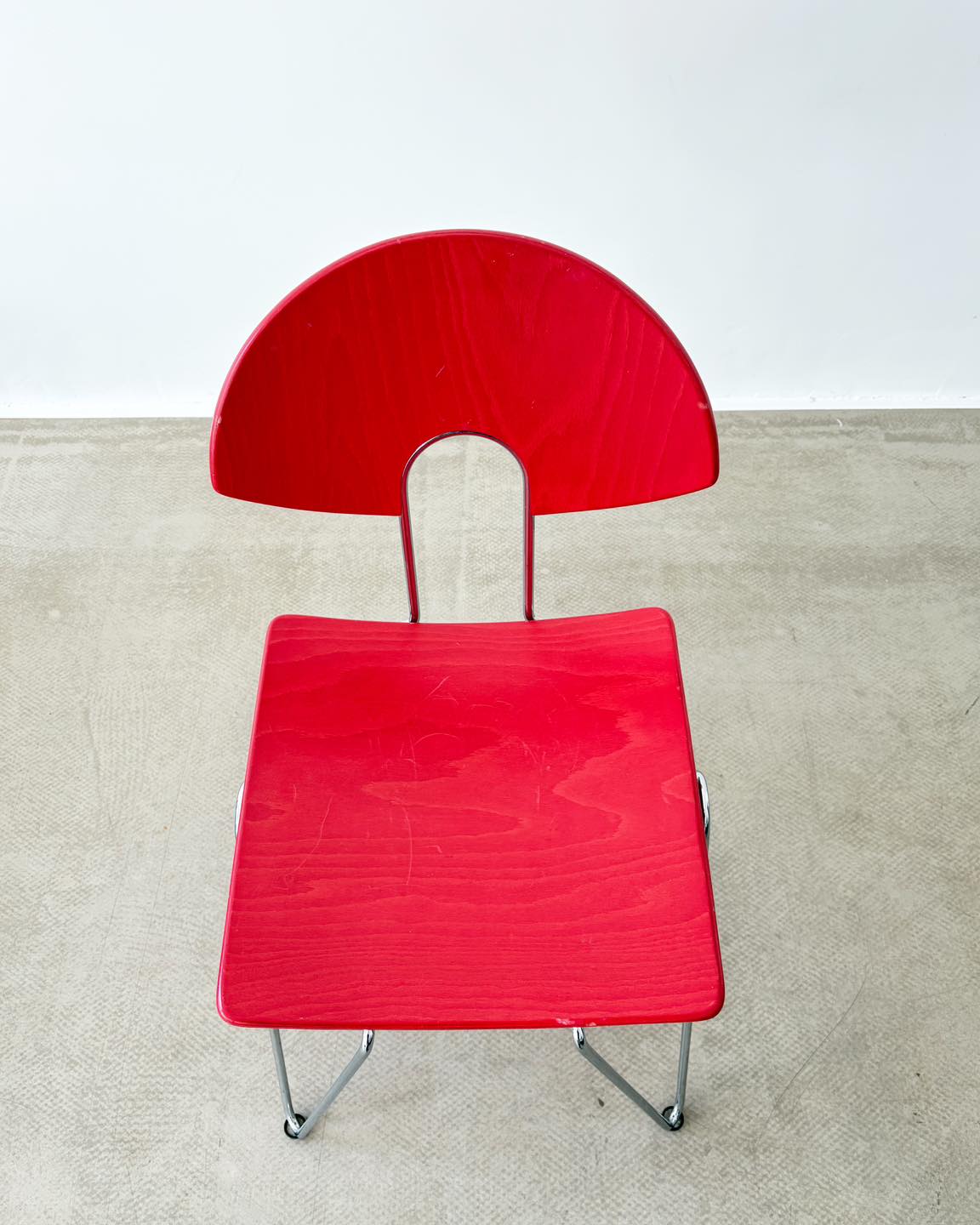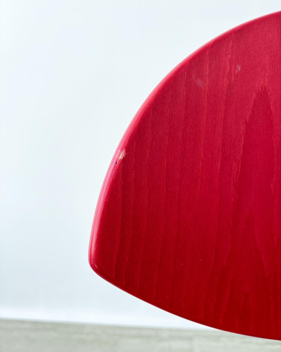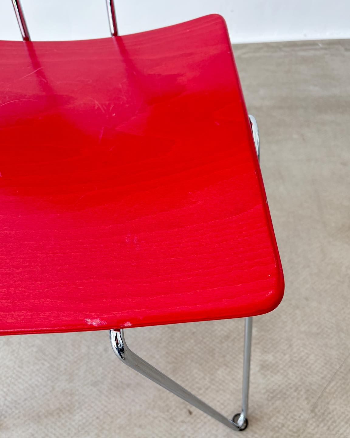 Materiały: metalowa konstrukcja, gięta sklejka bejcowana na kolor truskawkowej czerwieni i lakierowana.