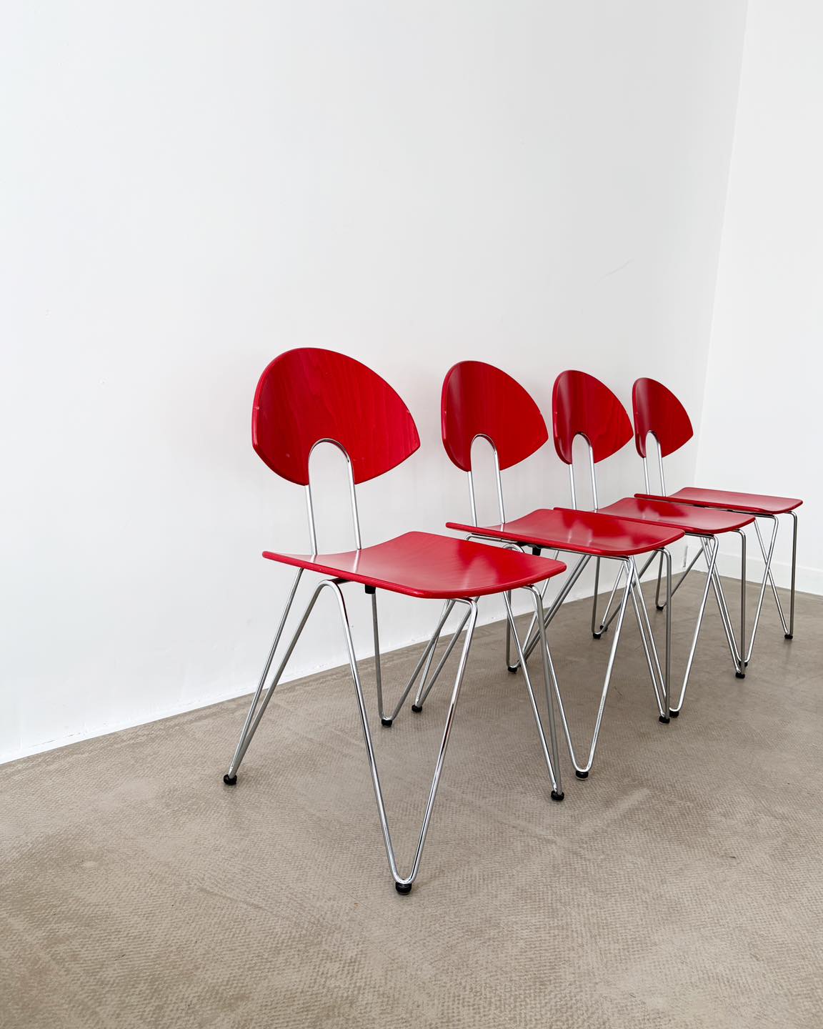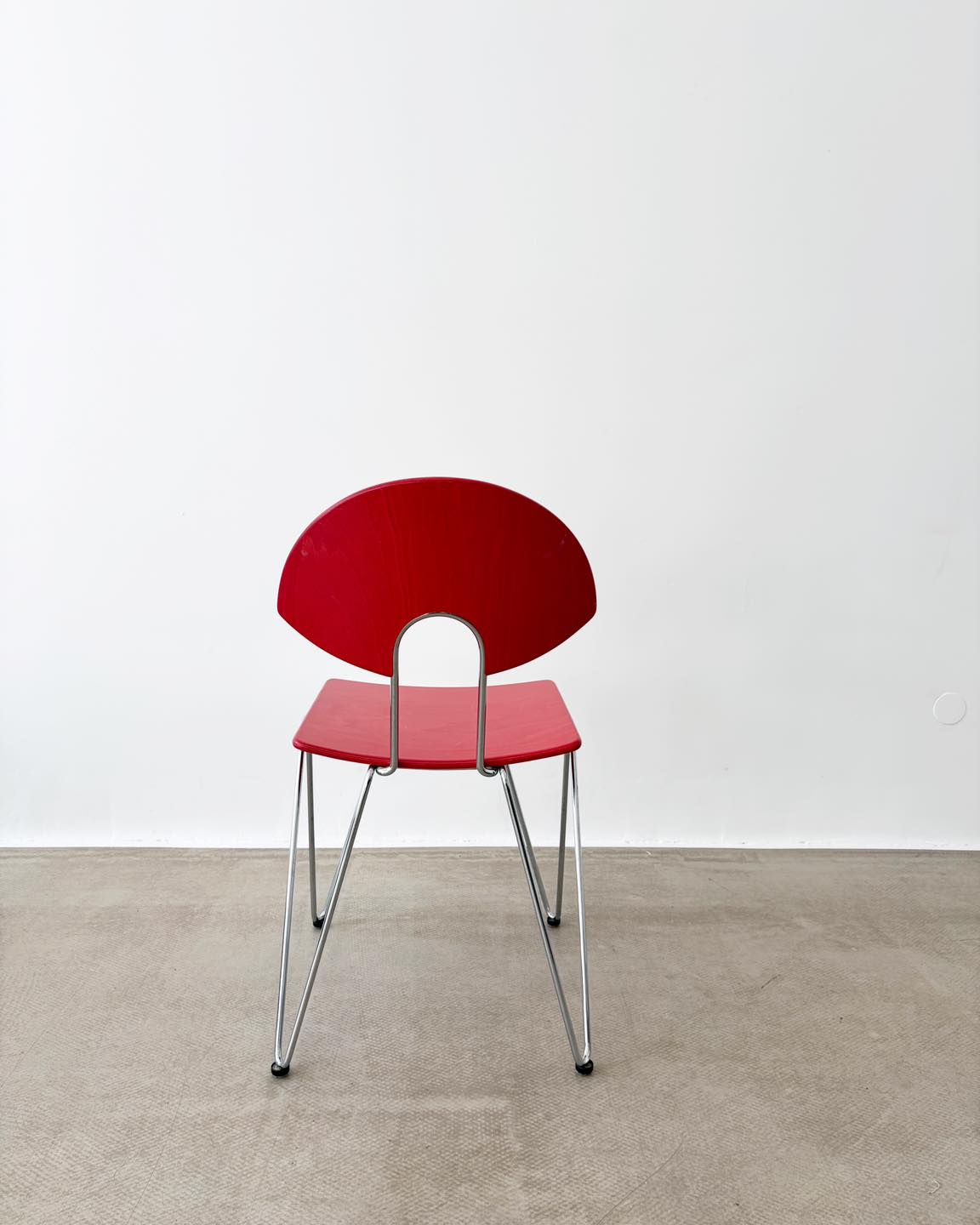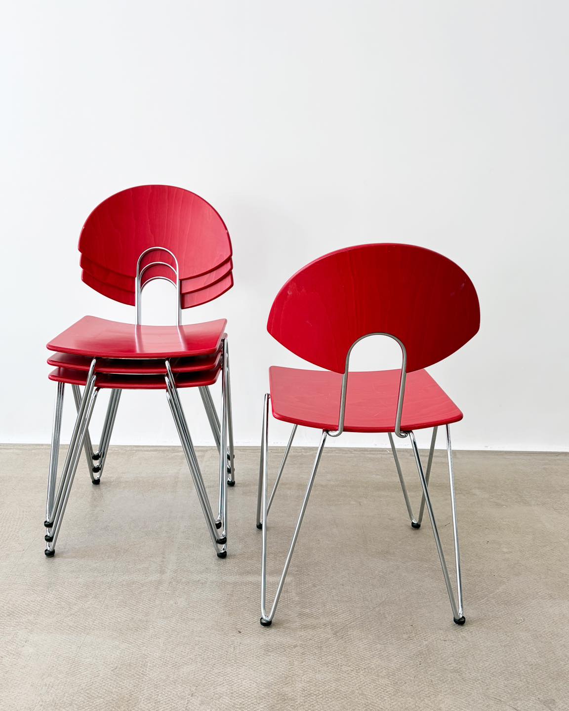 Materiały: metalowa konstrukcja, gięta sklejka bejcowana na kolor truskawkowej czerwieni i lakierowana.