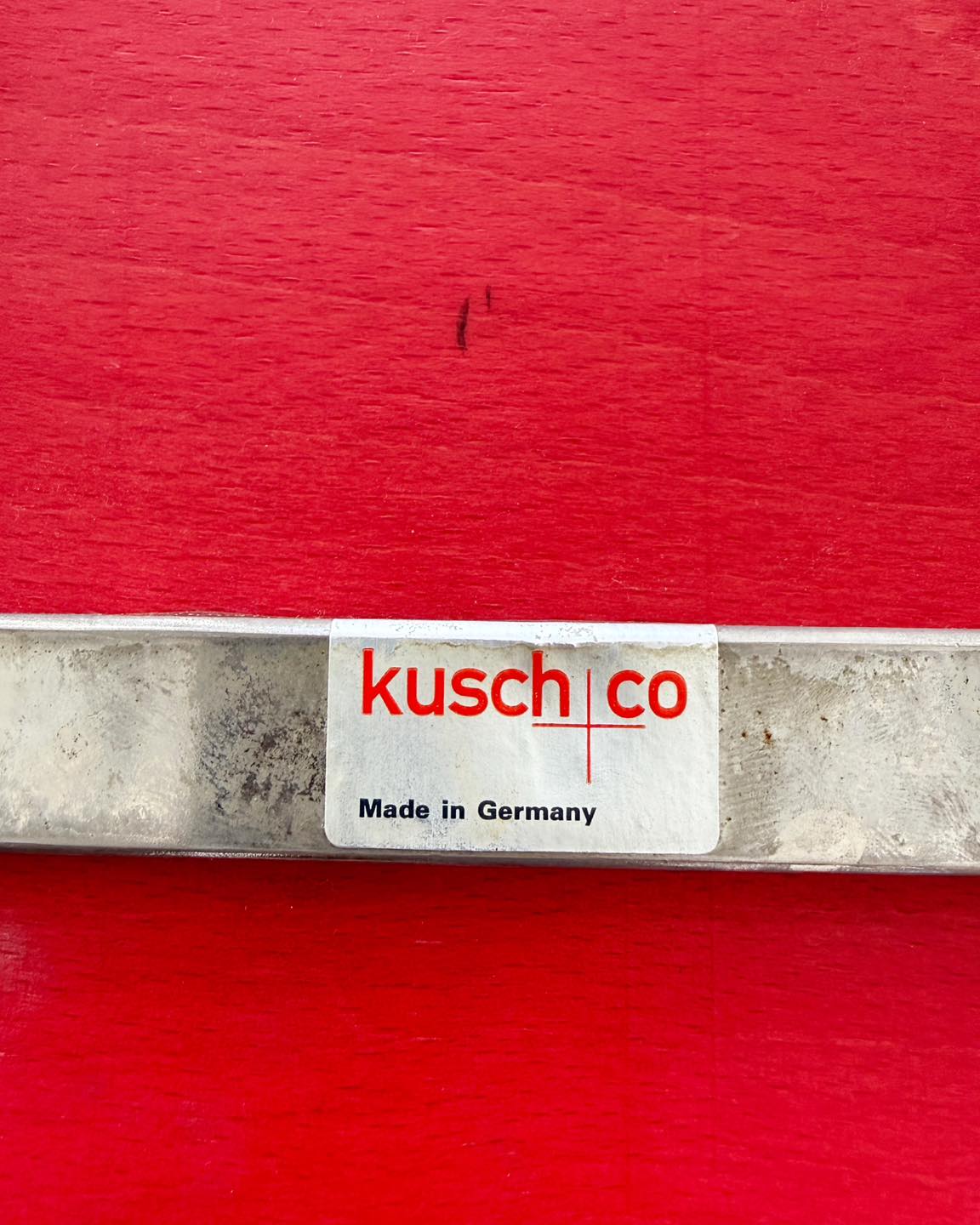Krzesło Mikado 1800 marki Kusch Co. Projekt Waltera Leemana z 1979r. wykorzystujący dość popularne w tamtym czasie połączenie lekkiej wizualnie metalowej ramy i siedziska z giętej sklejki. Tu przyjmuje dodatkowo finezyjny kształt oparcia (produkowano je w kilku różnych wersjach). Z oryginalną naklejką producenta na spodzie siedziska.
