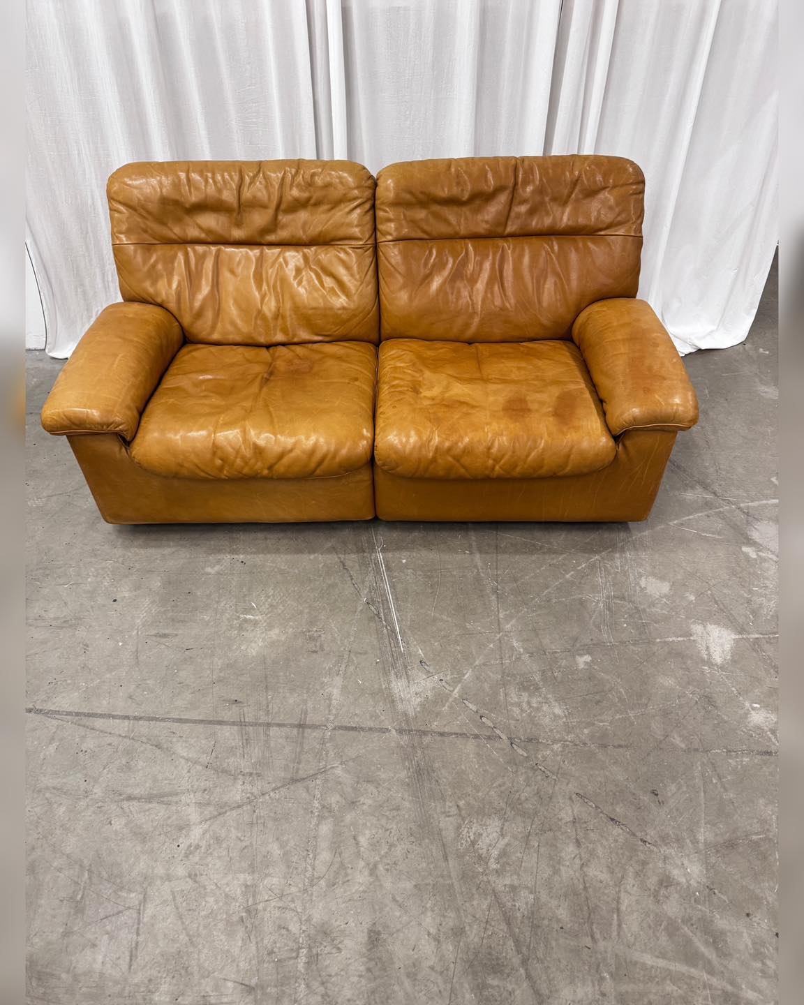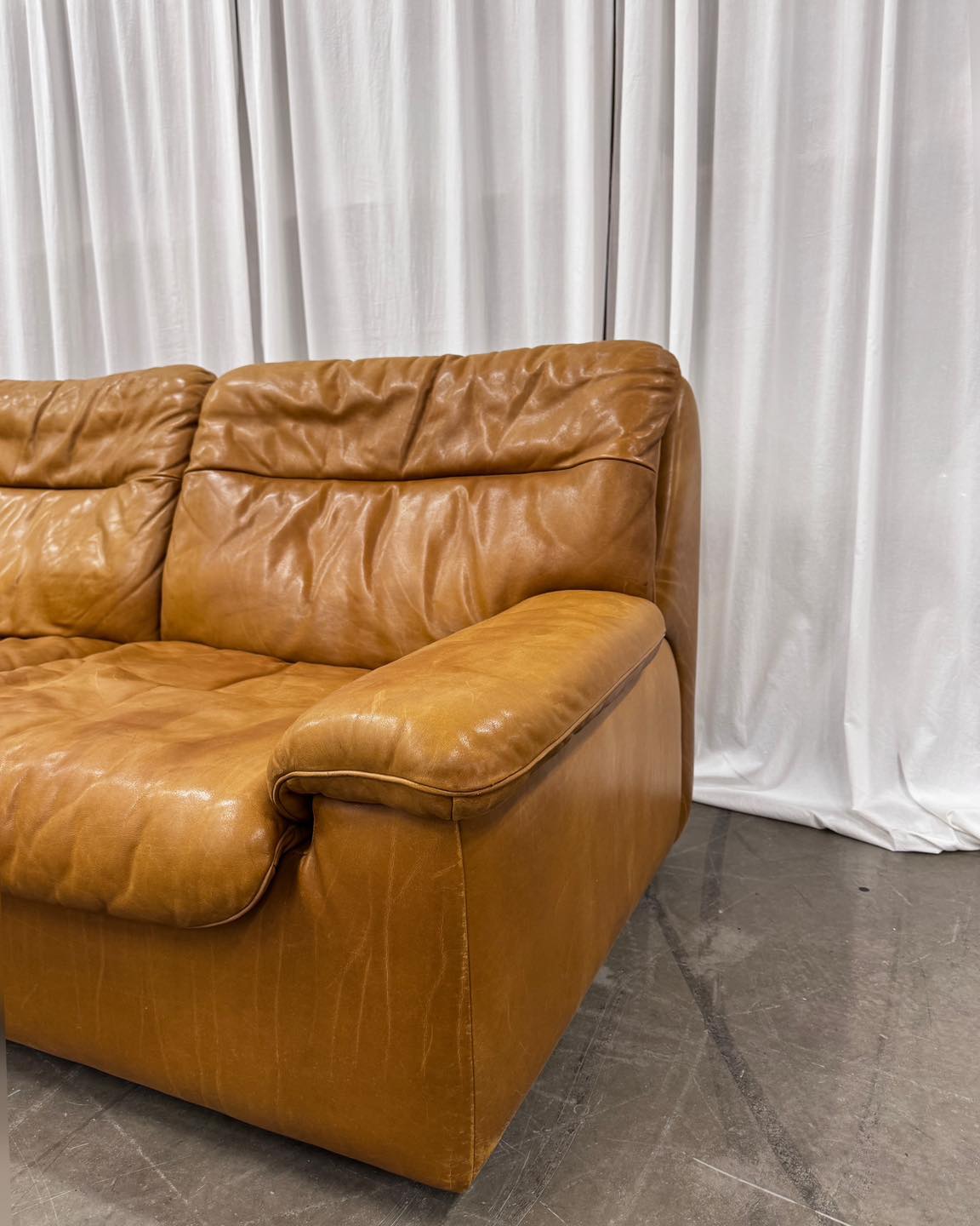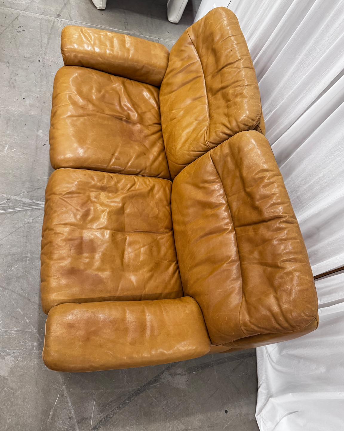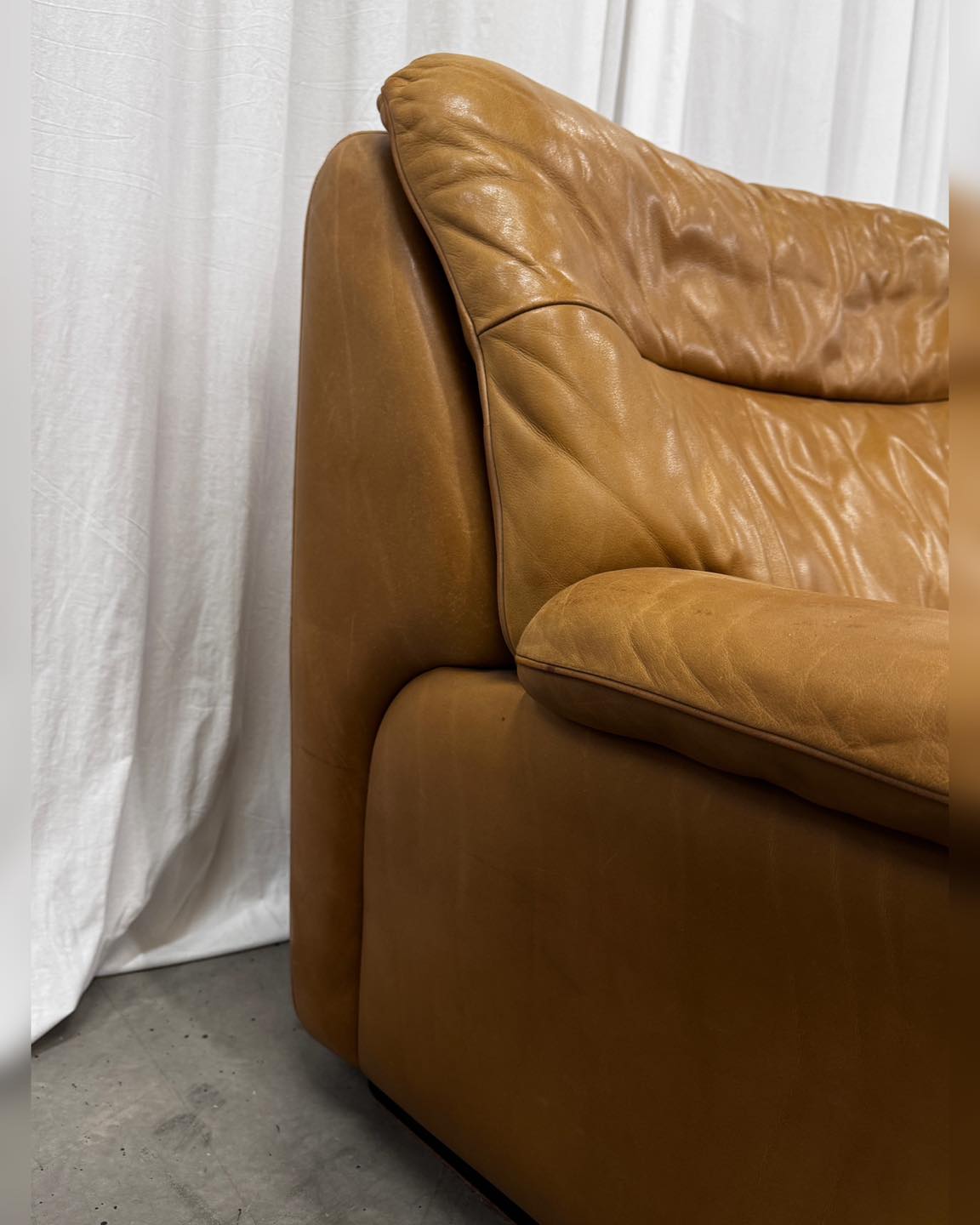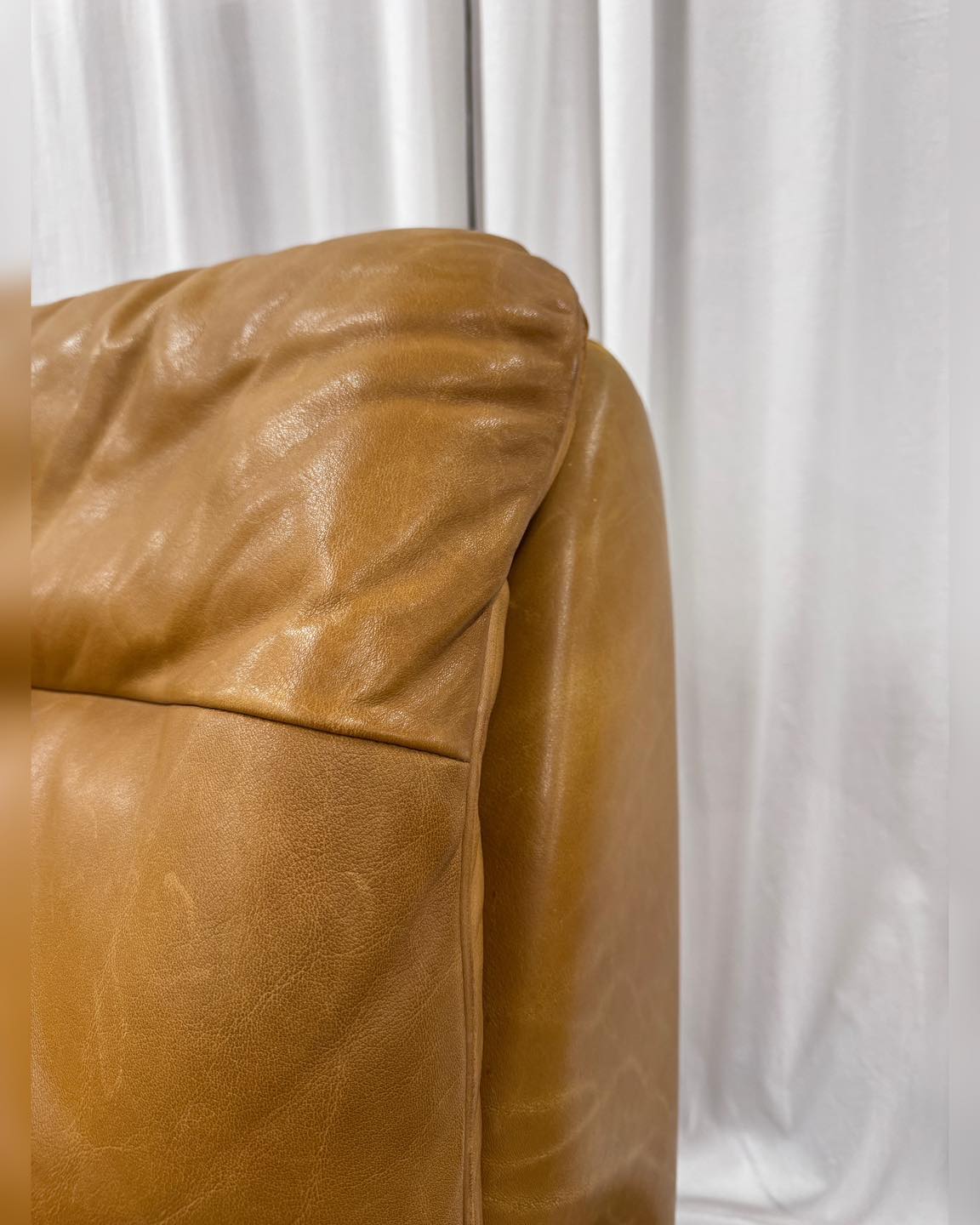Kolor karmelowy brąz. Uwagę zwraca świetnej jakości skóra, zupełnie inna od tych używanych współcześnie, dlatego mamy pewność, że ta sofa będzie się pięknie starzała. Mebel klasy premium zarówno w sferze jakości wykonania, użytych materiałów, jak i komfortu. Ciężka i bardzo solidna, przy tym szalenie wygodna.