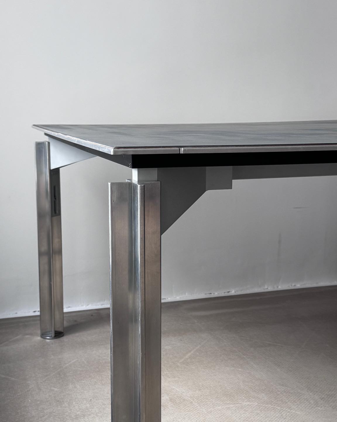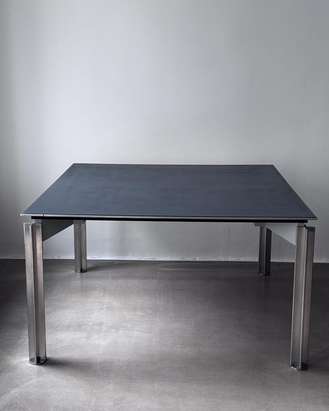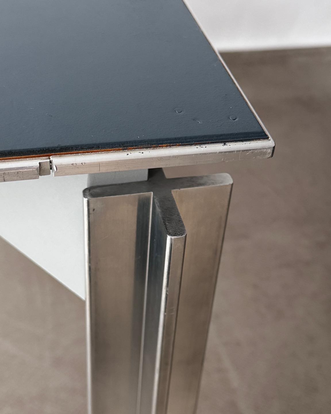 Materiały: konstrukcja z metalu, rama blatu z metalu, wypełnienie z malowanej sklejki, noga ze stali. Bardzo ciężki, nogi demontowalne do transportu.