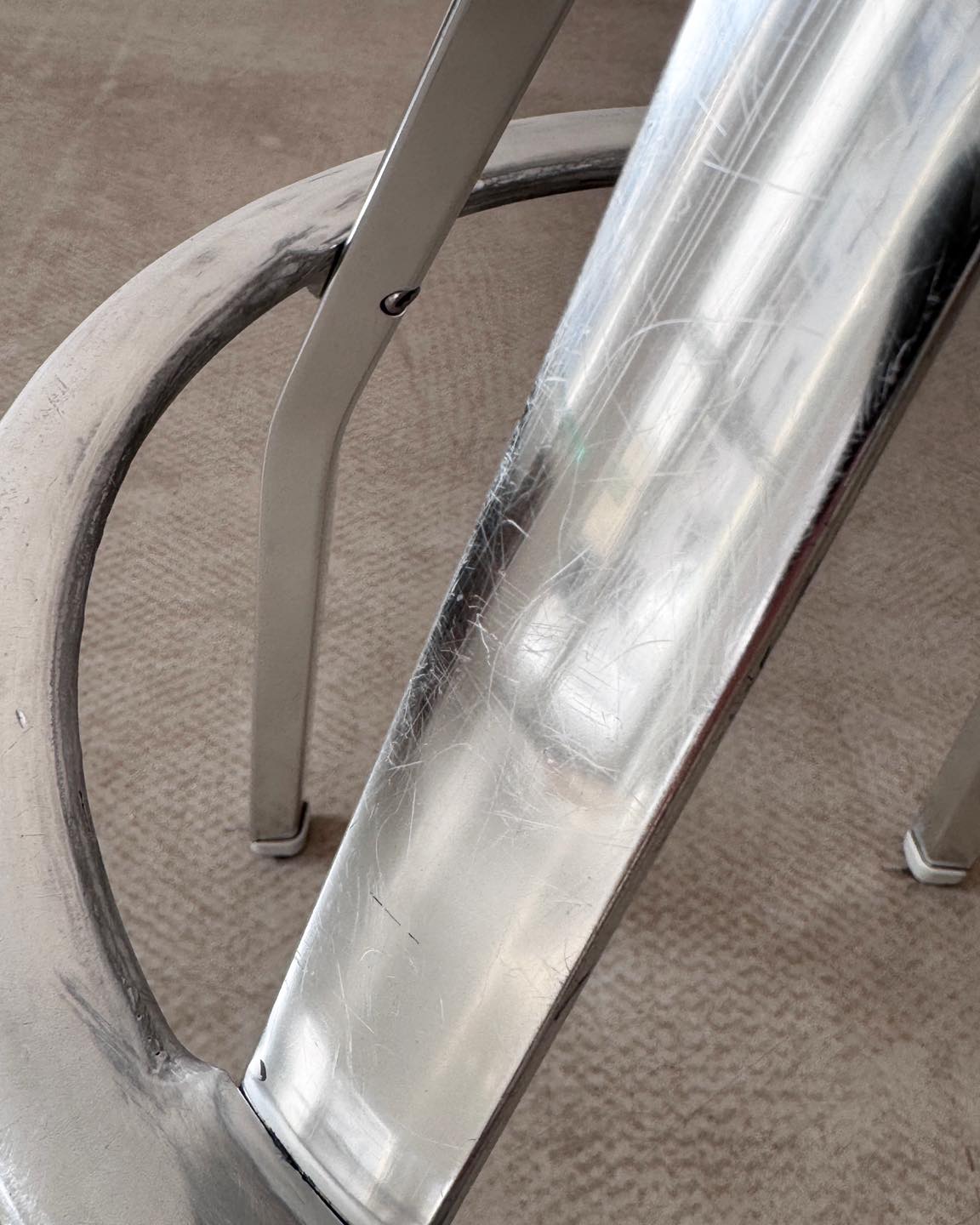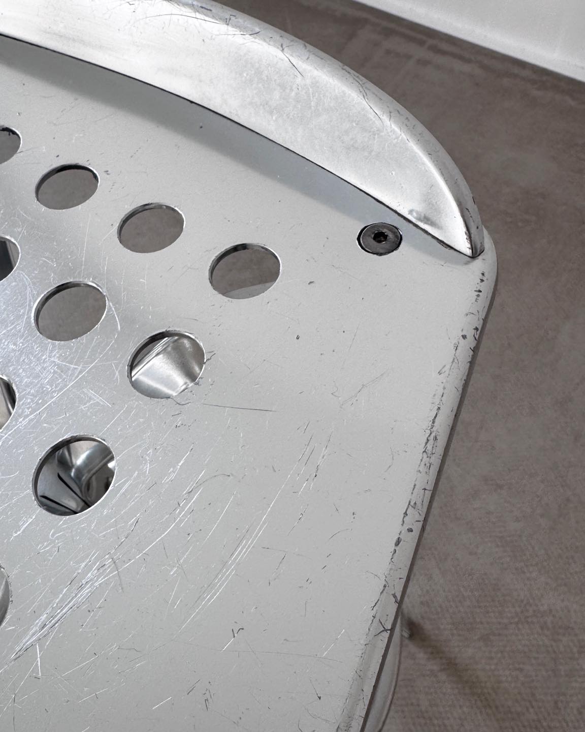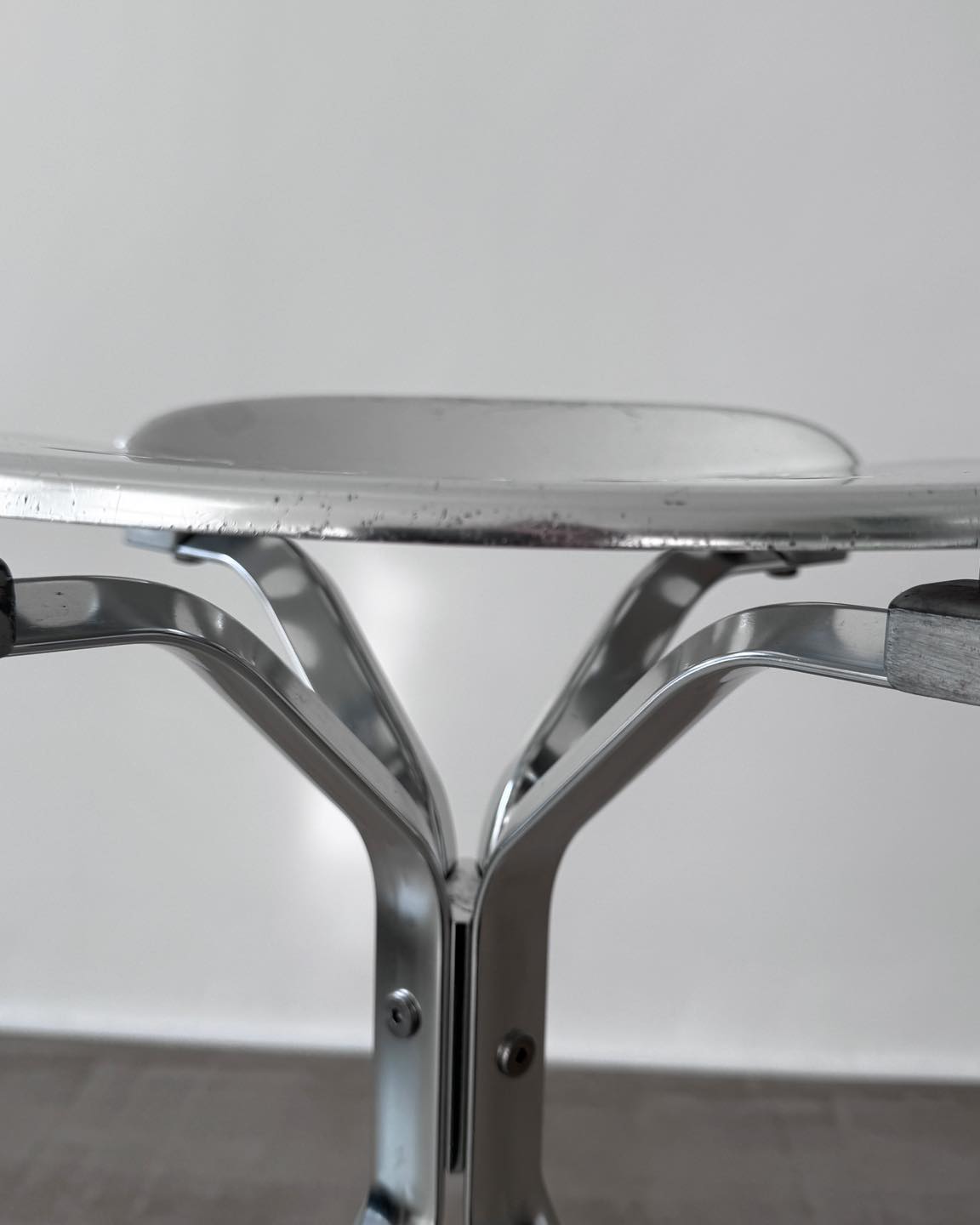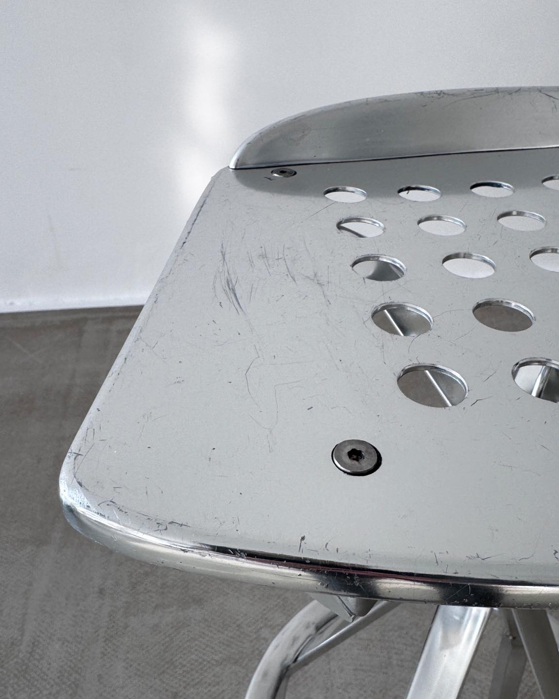 Stan:dostateczny. Konstrukcyjnie stołki bez zarzutu. Ocenę za stan obniżają liczne zarysowania aluminium, widoczne na ostatnich zdjęciach, będące śladami intensywnego użytkowania przez lata. Cóż, widocznie były bardzo lubiane.
