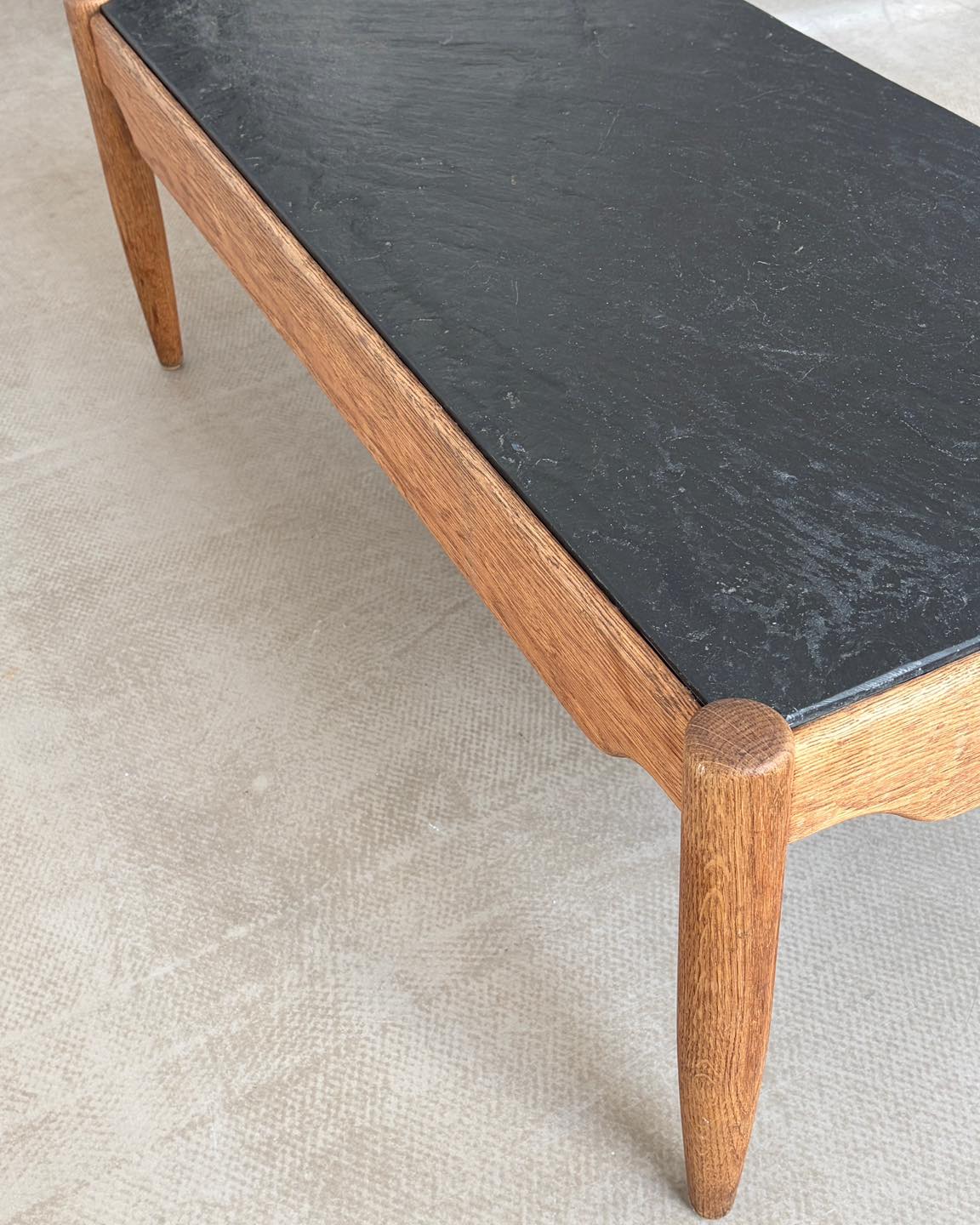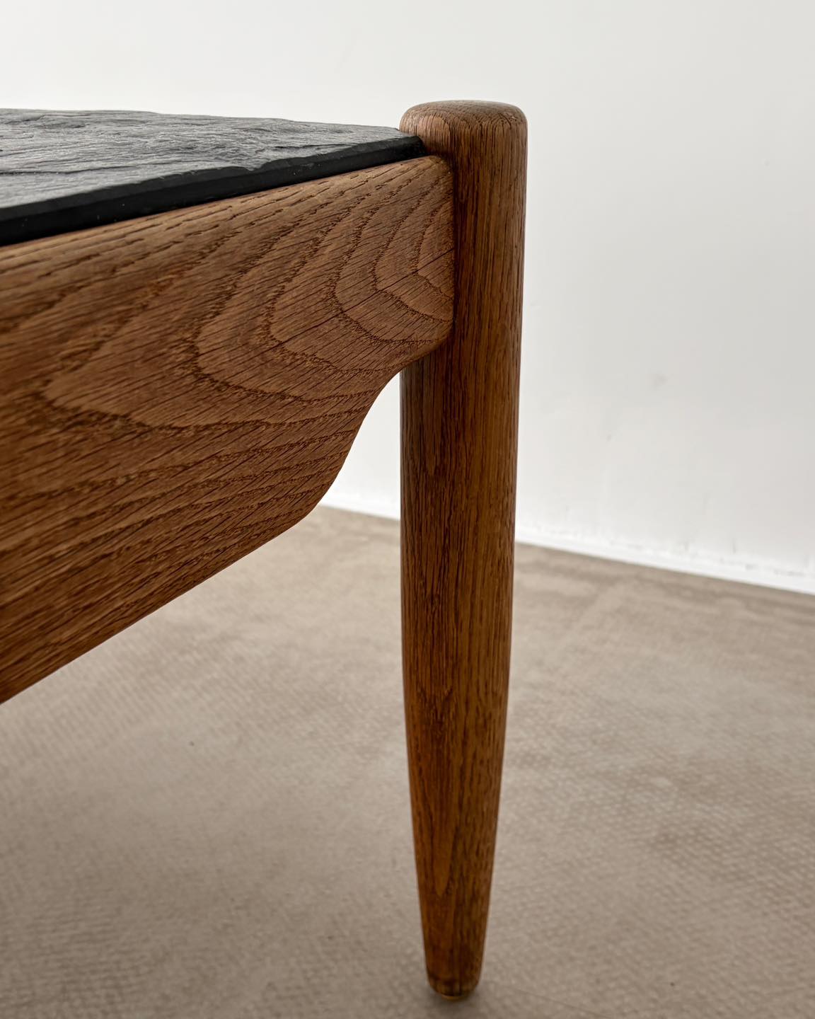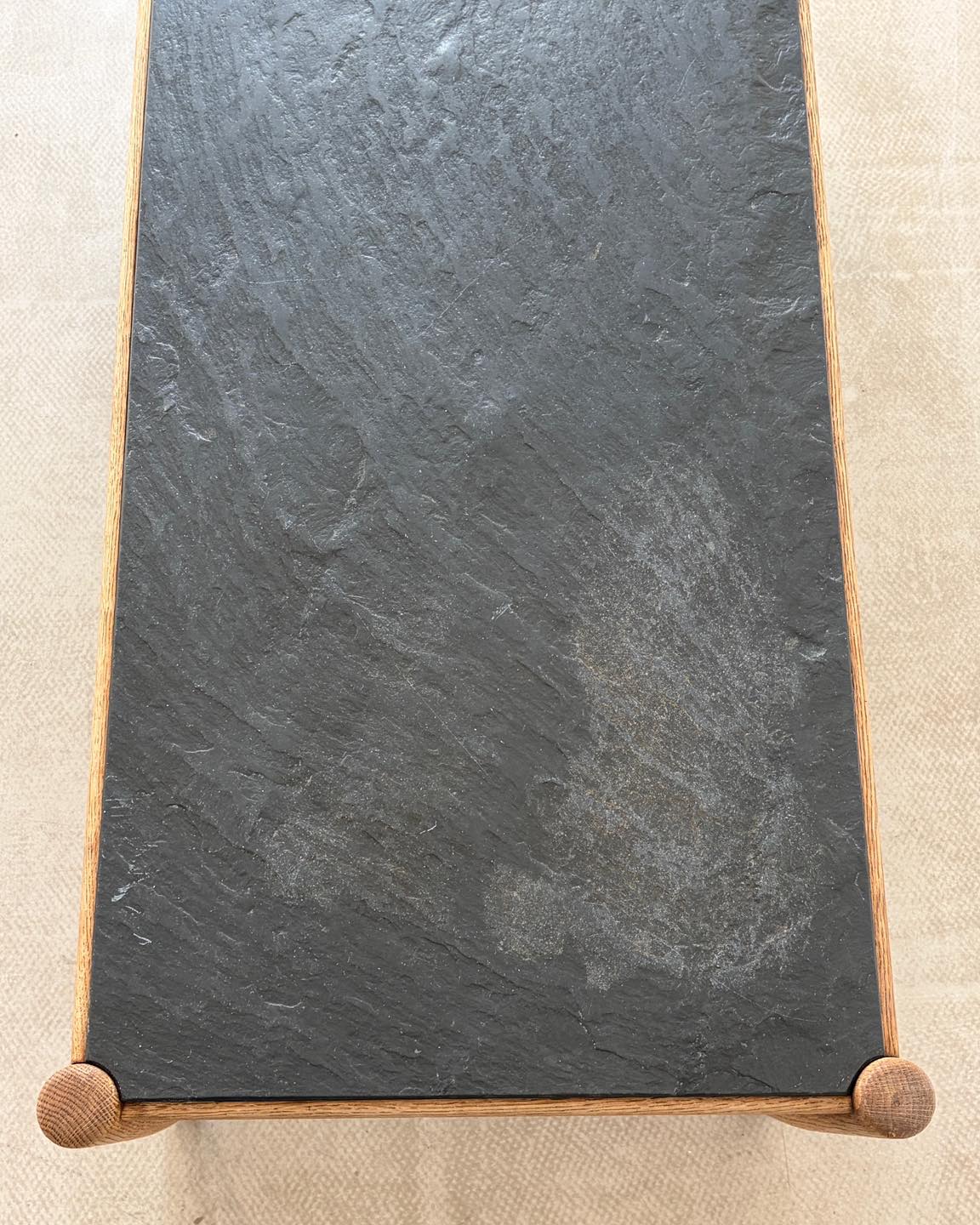 Materiały: rama z drewna tekowego lub dębowego, blat z łupka.