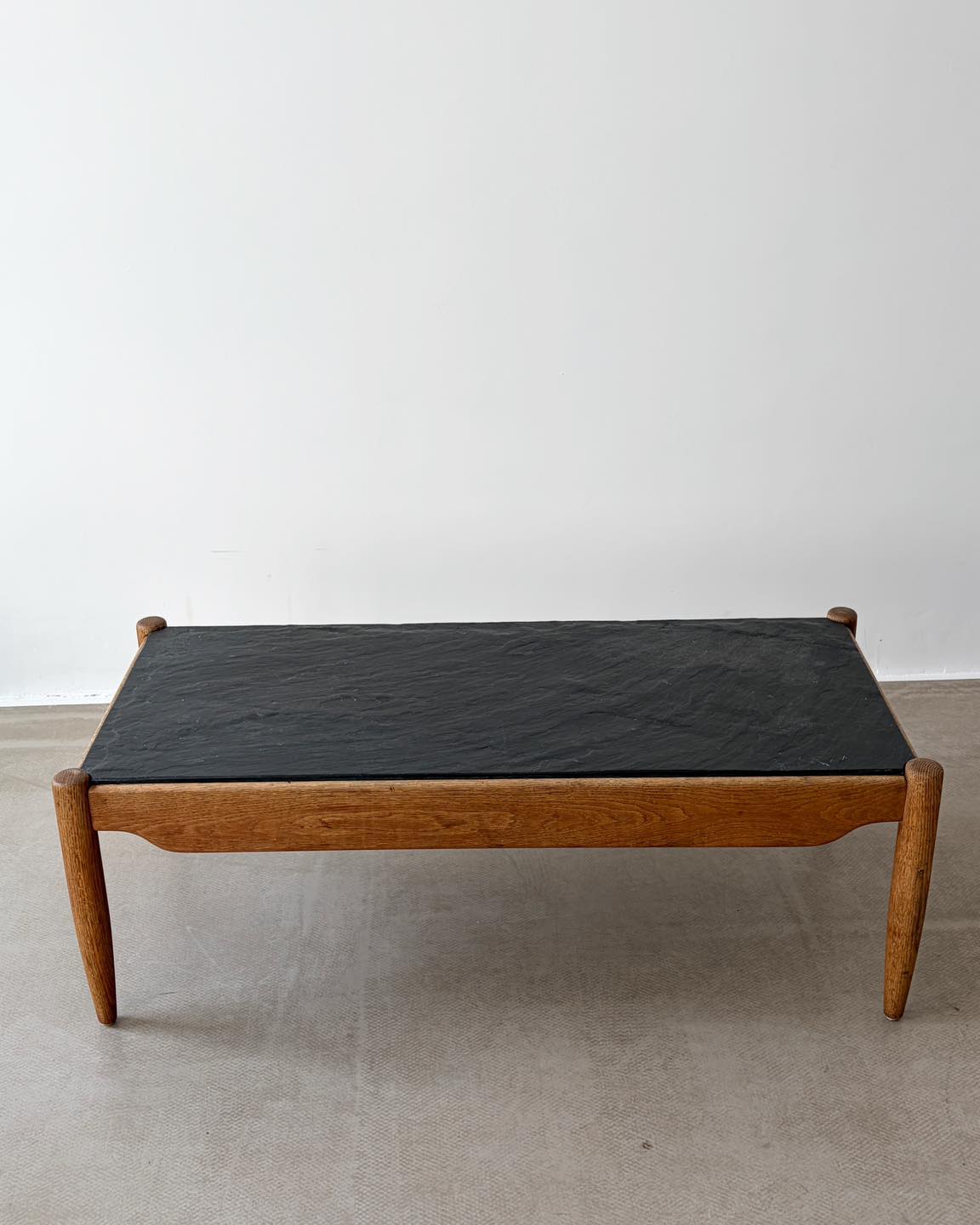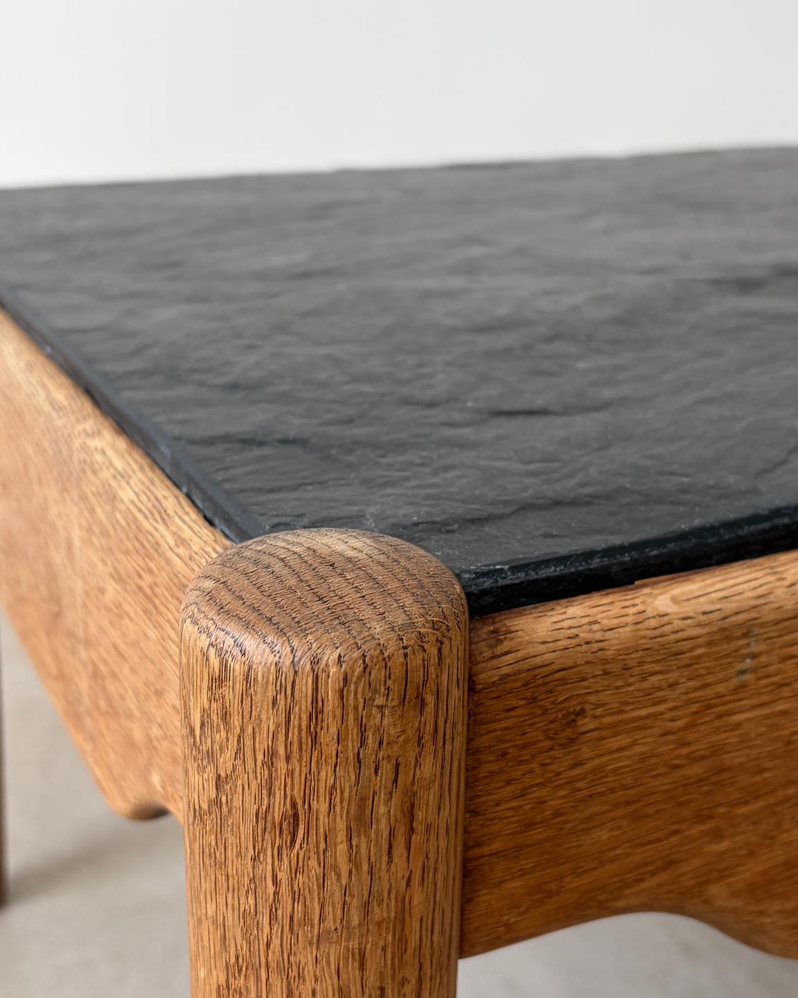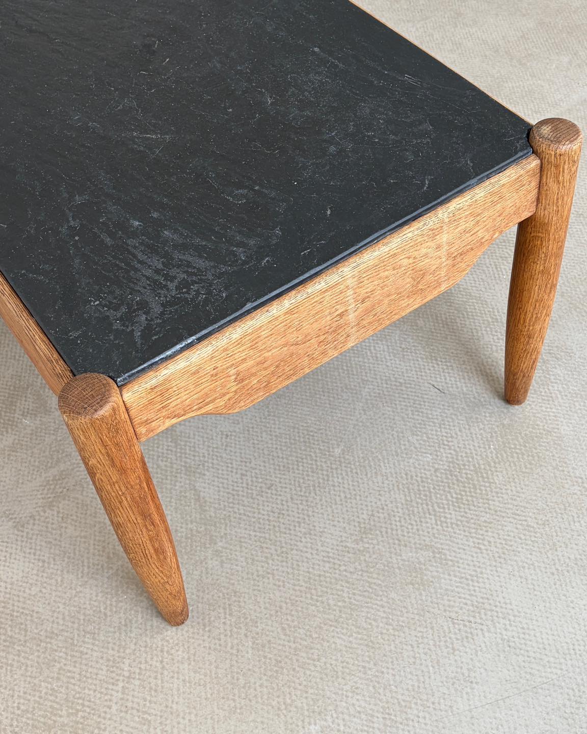 Materiały: rama z drewna tekowego lub dębowego, blat z łupka.