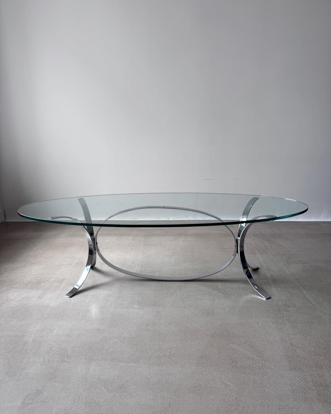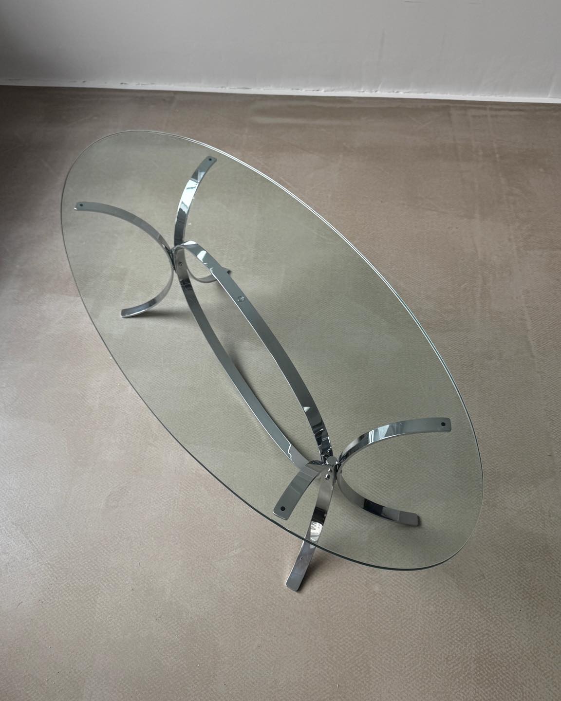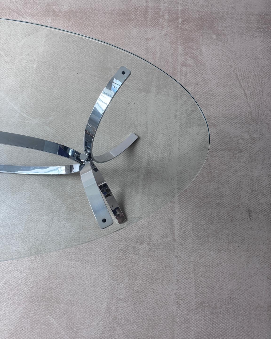 Stolik w stylu mid century modern. Duży, owalny, szklany blat osadzony na efektowniej chromowanej konstrukcji.