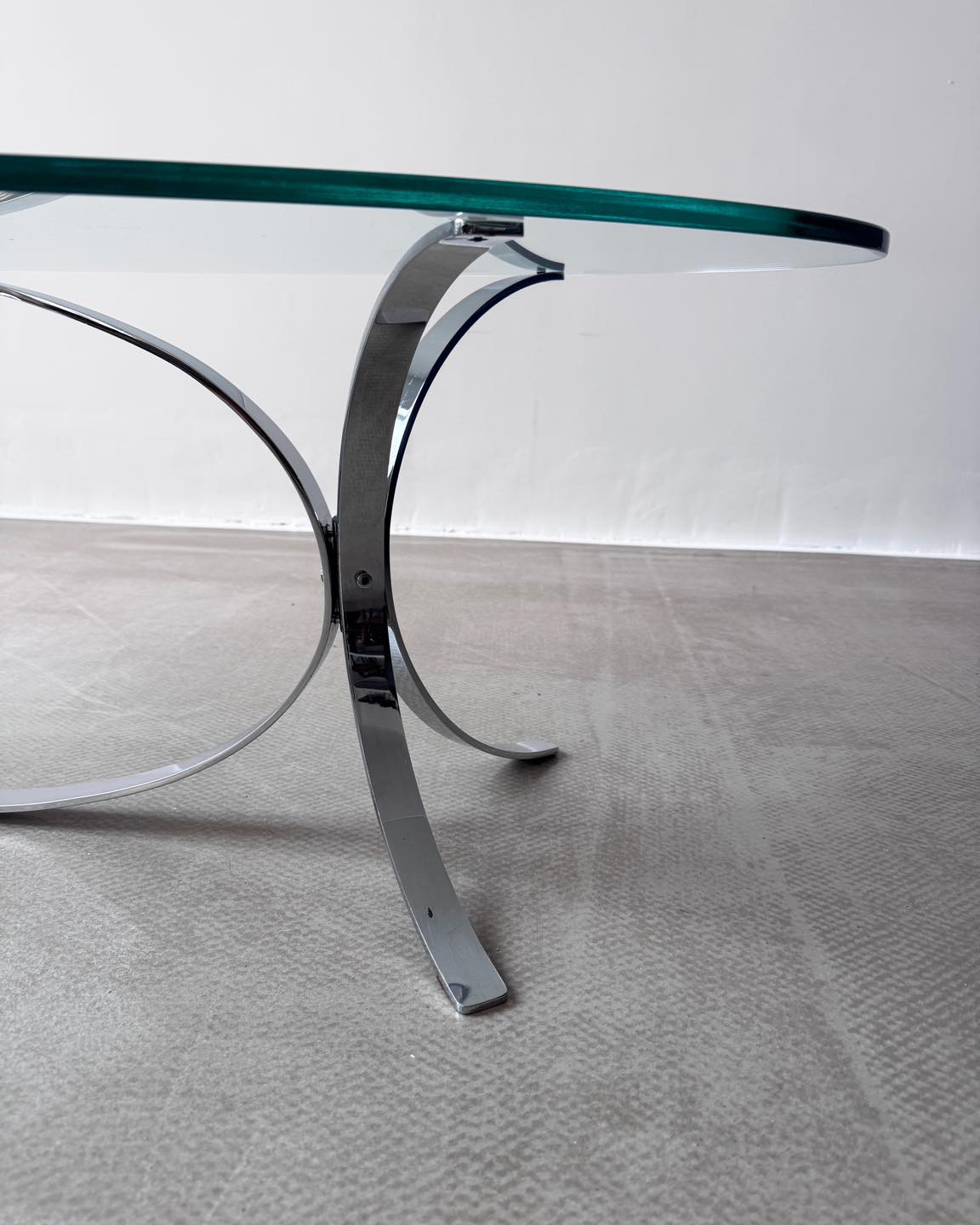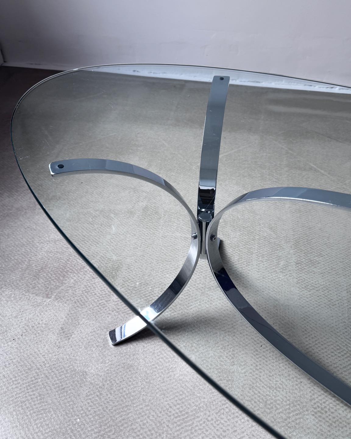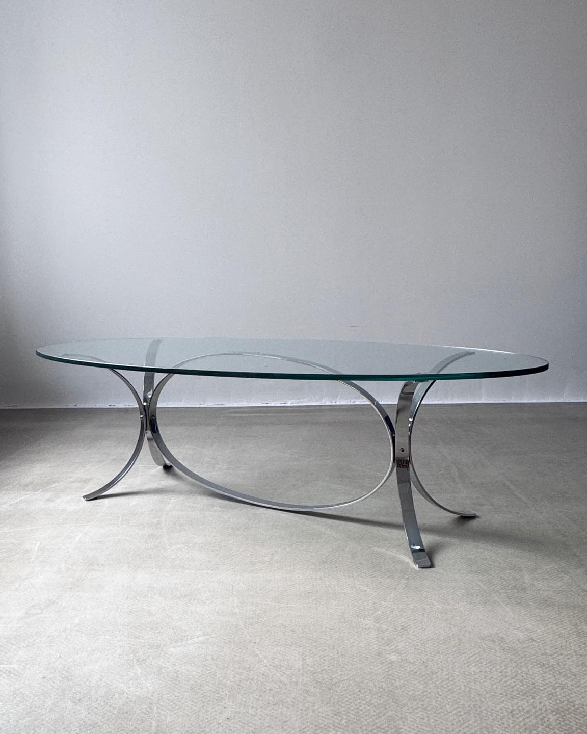 Stolik w stylu mid century modern. Duży, owalny, szklany blat osadzony na efektowniej chromowanej konstrukcji.