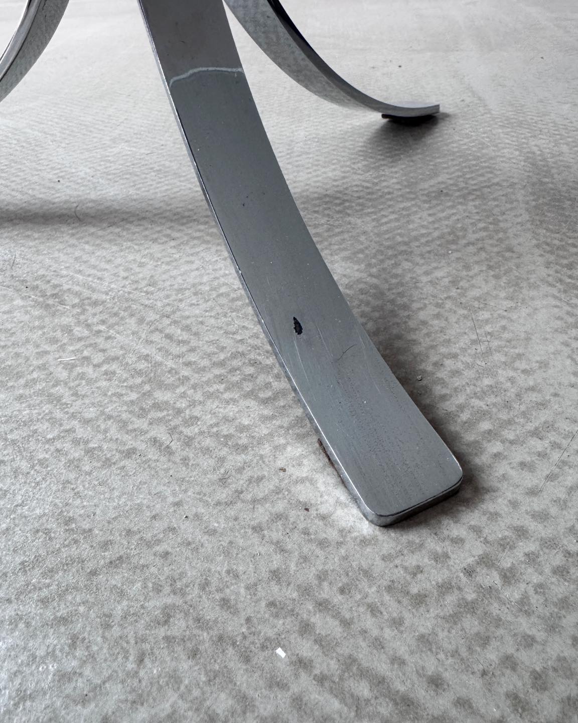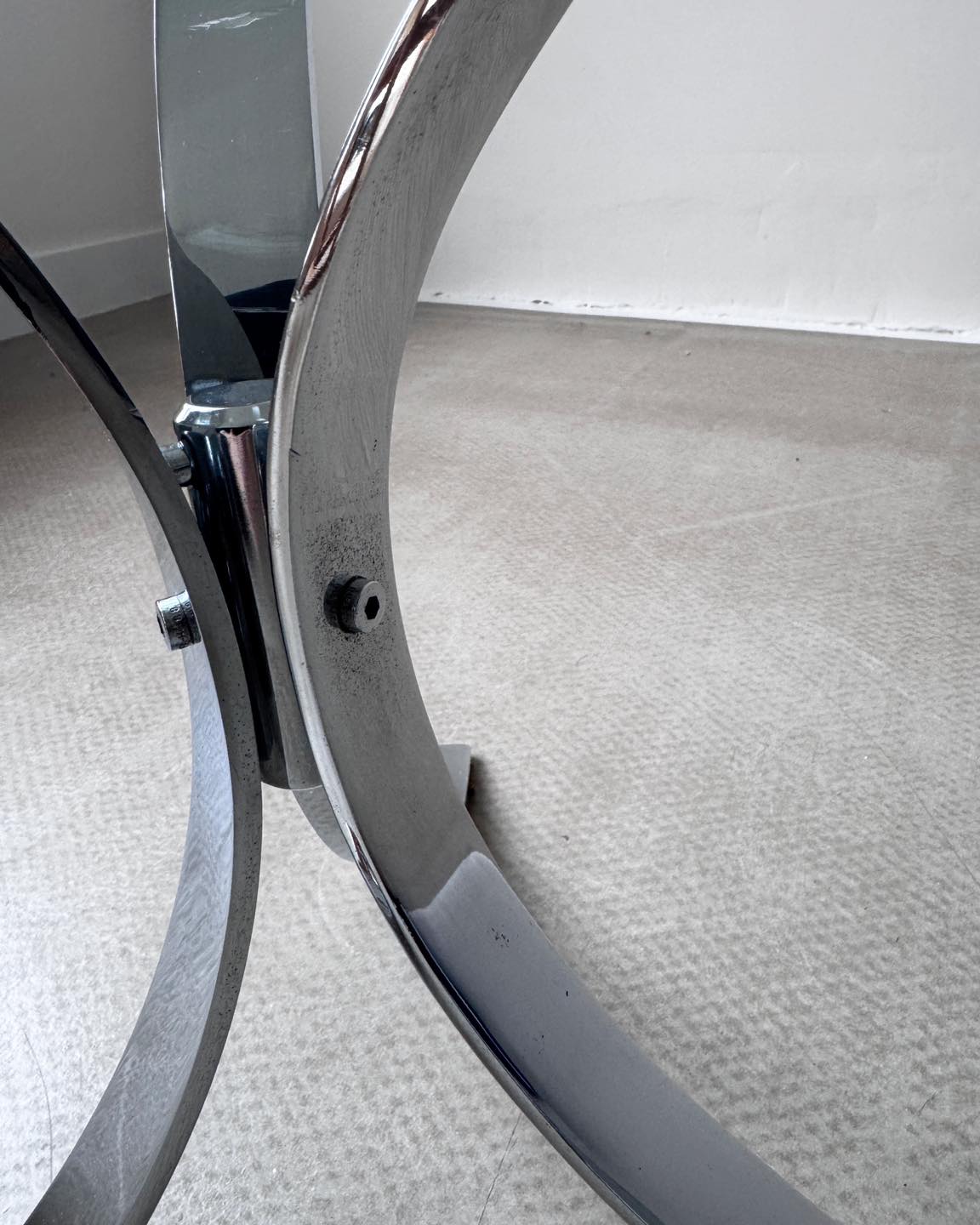 Stan: bardzo dobry vintage (chrom z drobnym miejscowym nalotem, jeden ubytek w warstwie chromu — widoczne na foto), szkło bez wyszczerbień i ubytków, z rysami właściwymi dla mebli używanych.