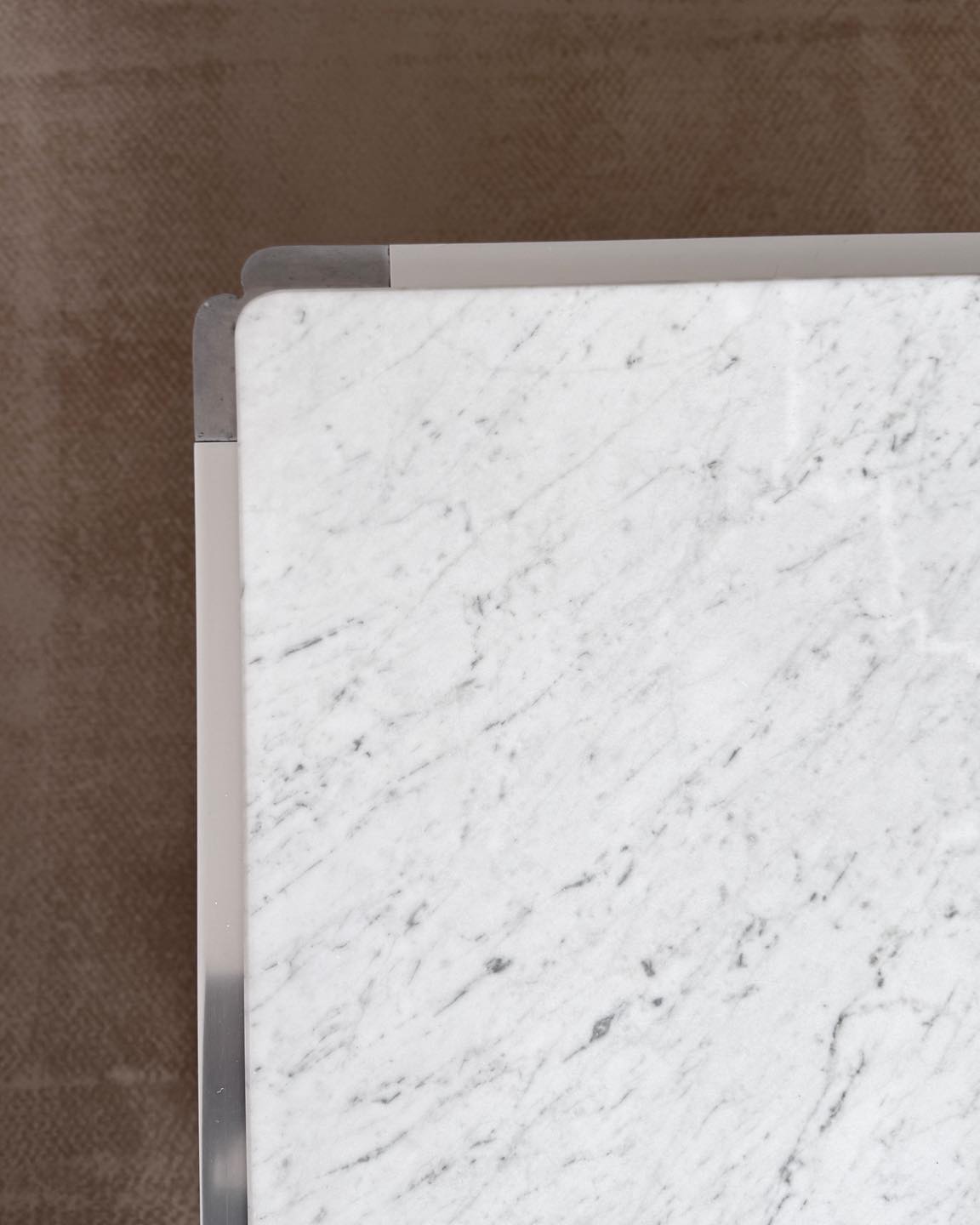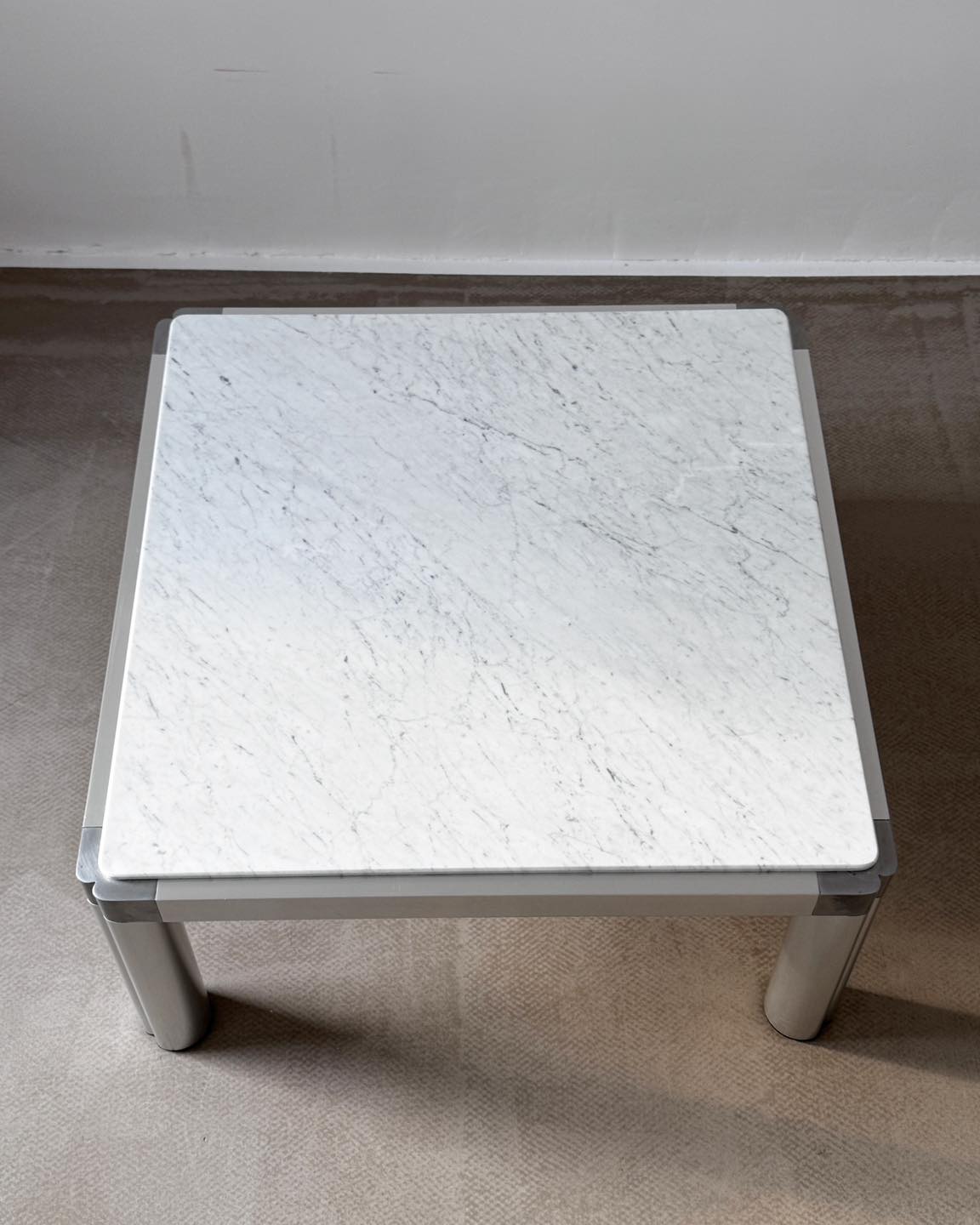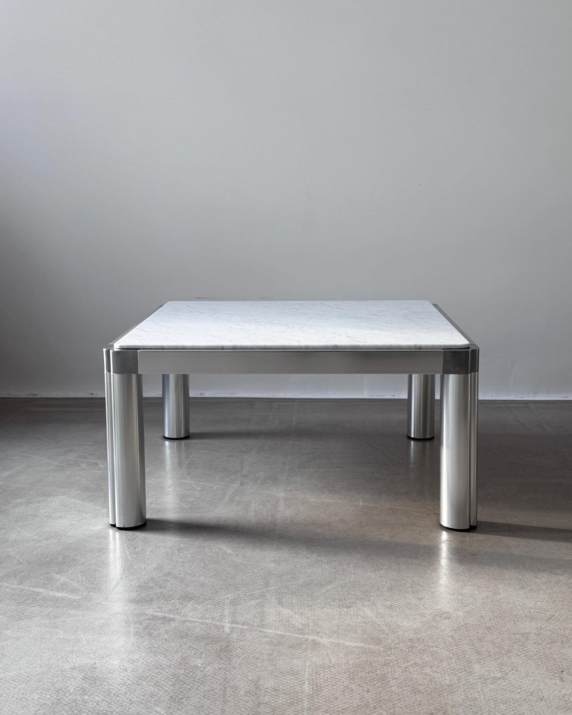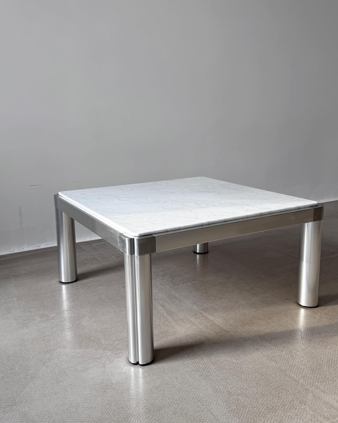 Stolik kawowy zaprojektowany przez Kho liang w 1974r. To rzadko spotykana wersja łącząca aluminiową ramę z marmurem.