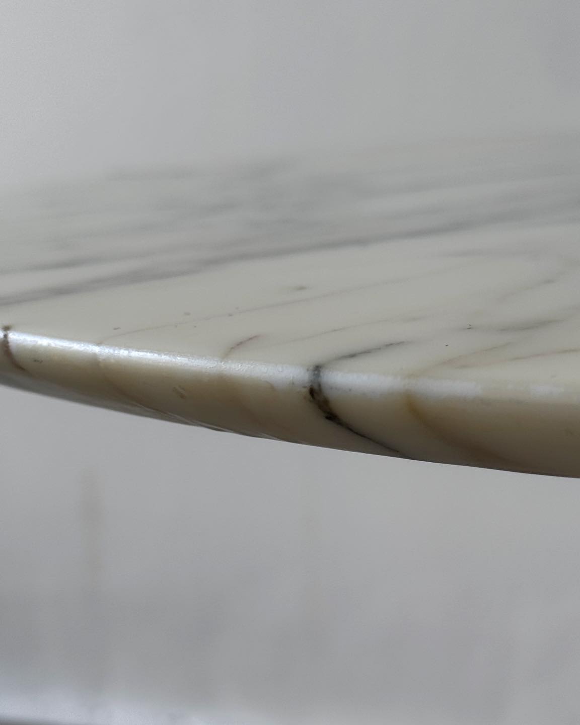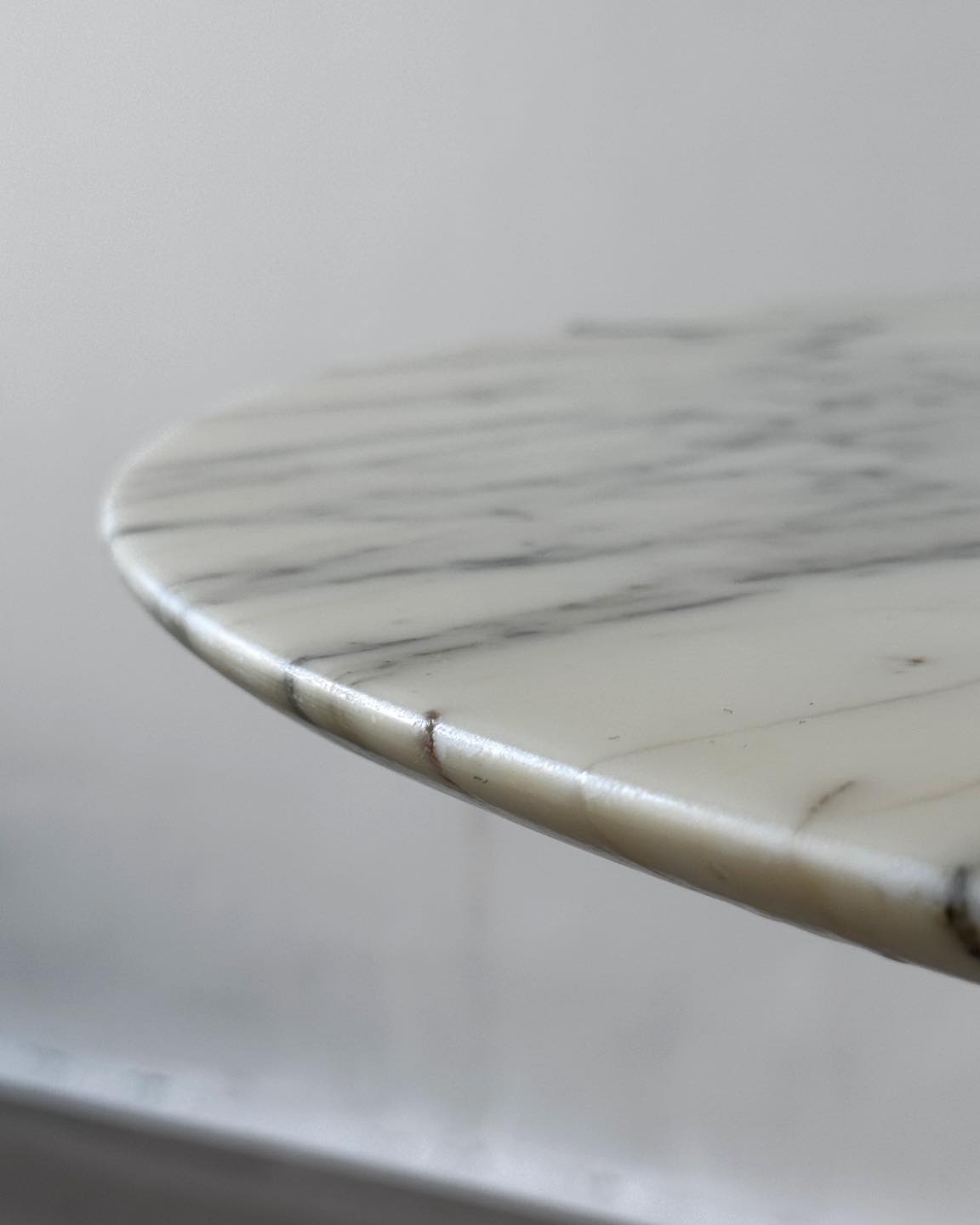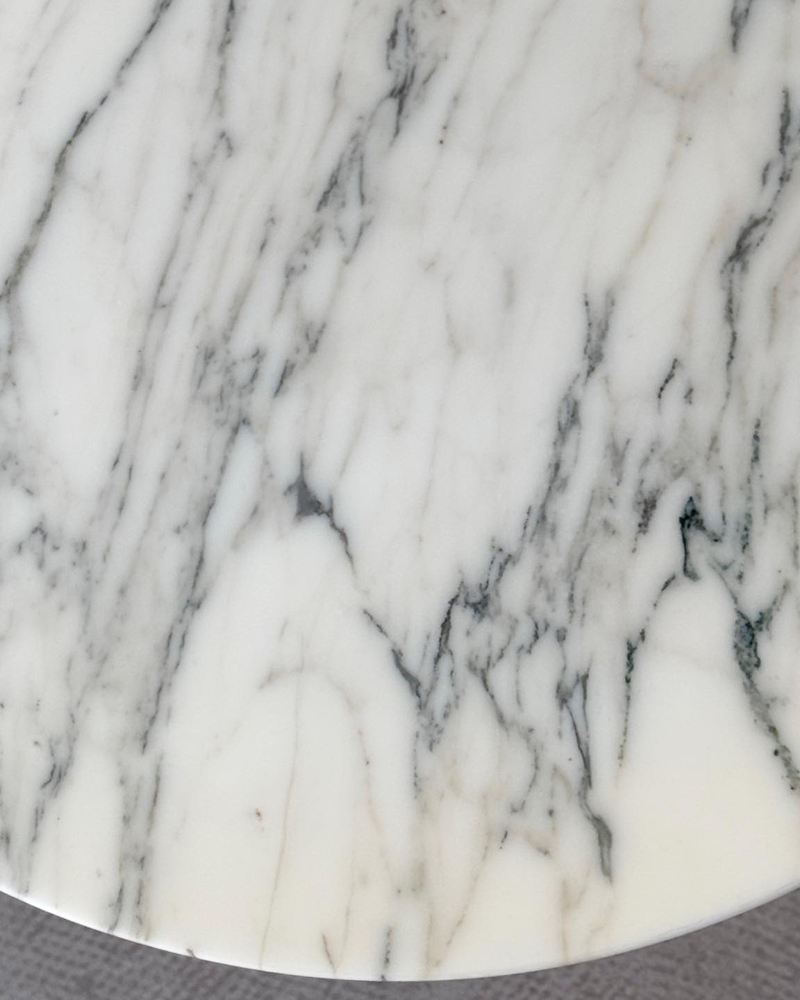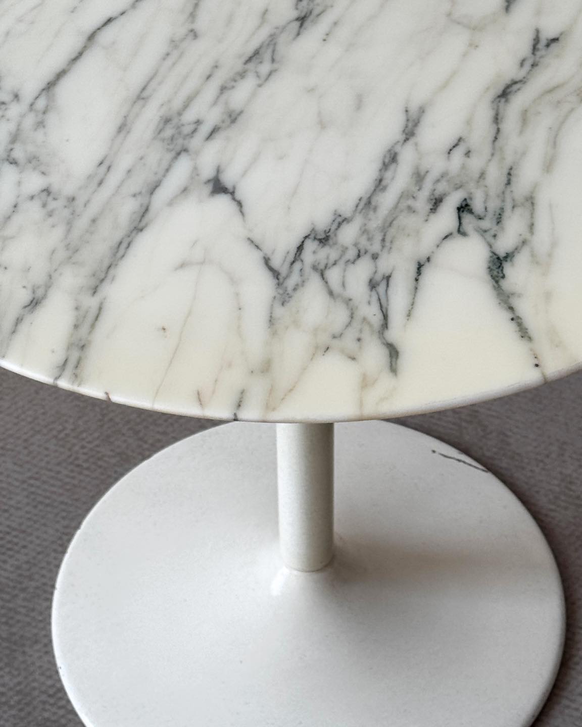 Stolik z marmurowym blatem na charakterystycznej nodze tulip. Przepięknie użyłkowany i ciekawy kolorystycznie blat łączący butter yellow z nutą szarości, czerni i ciemnej zieleni.