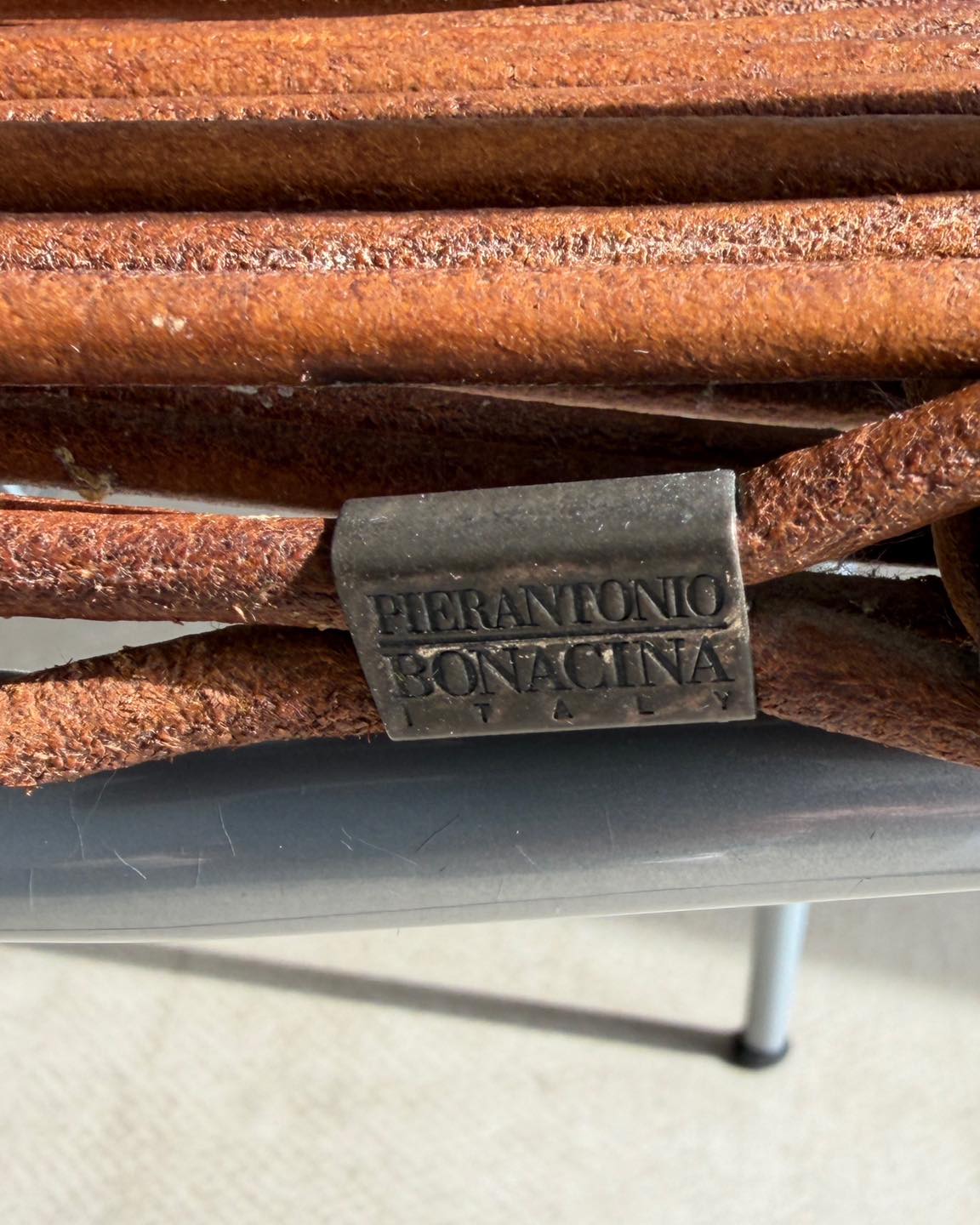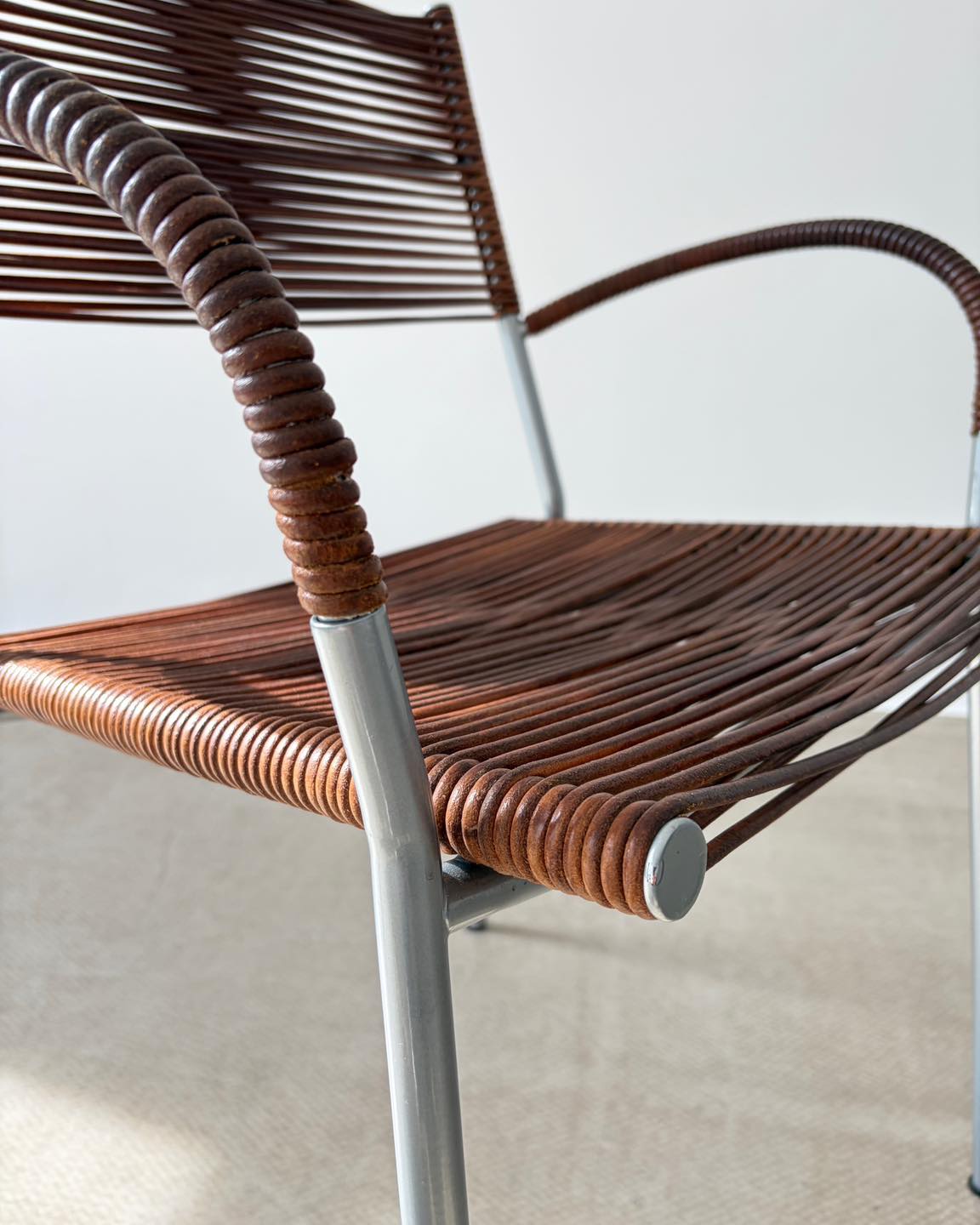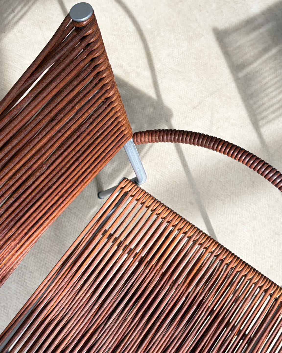 Forma bardzo lekka, przezierna, którą tworzą skórzane rzemienie rozpięte na metalowym stelażu. Niejako dodatkowym atrybutem tej formy jest gra światła, które tworzy przepiękne scenerie we wnętrzu. Nie bez znaczenia jest także widoczna patyna, wydobywająca głęboki bursztynowy kolor skóry. Sygnowane.
