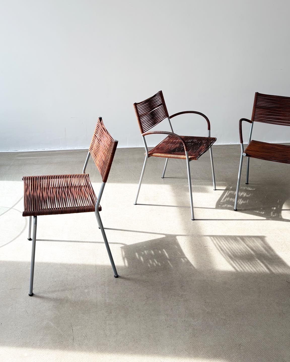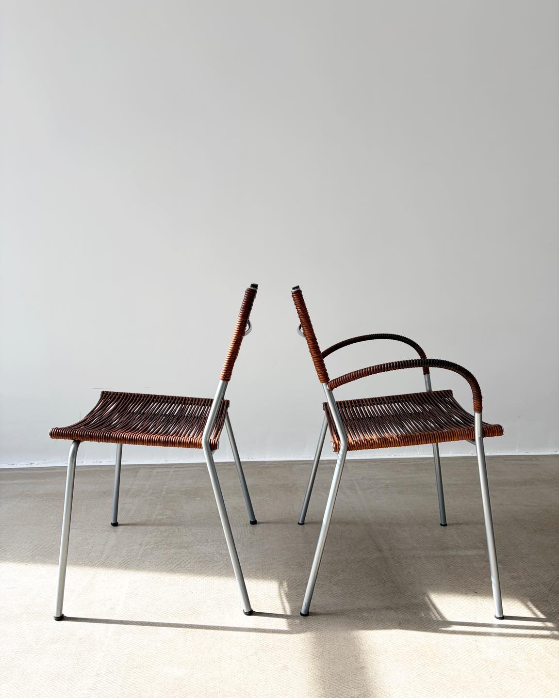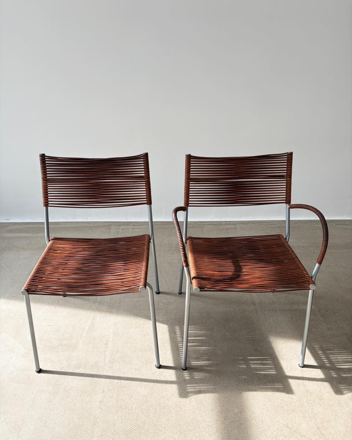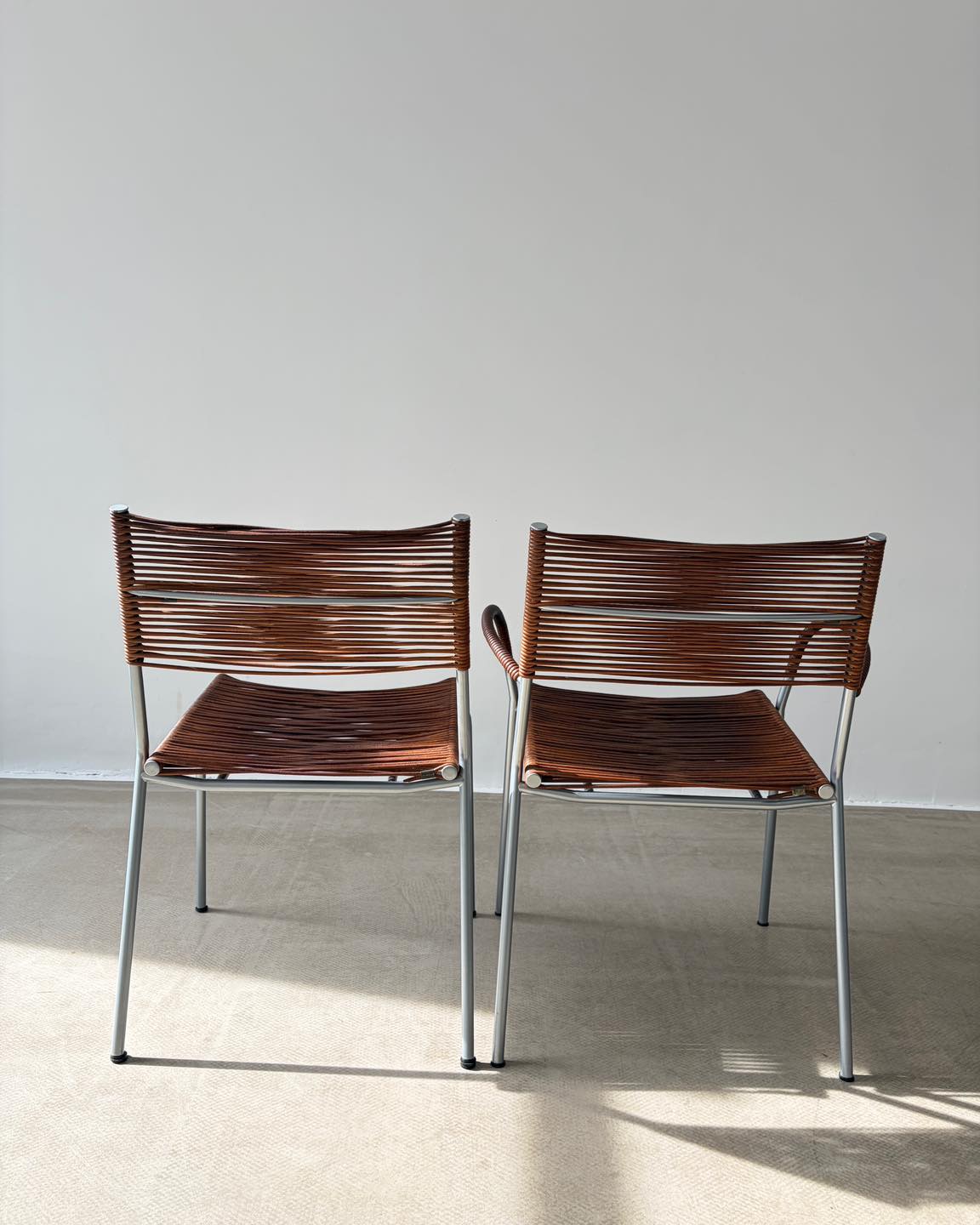 Forma bardzo lekka, przezierna, którą tworzą skórzane rzemienie rozpięte na metalowym stelażu. Niejako dodatkowym atrybutem tej formy jest gra światła, które tworzy przepiękne scenerie we wnętrzu. Nie bez znaczenia jest także widoczna patyna, wydobywająca głęboki bursztynowy kolor skóry. Sygnowane.
