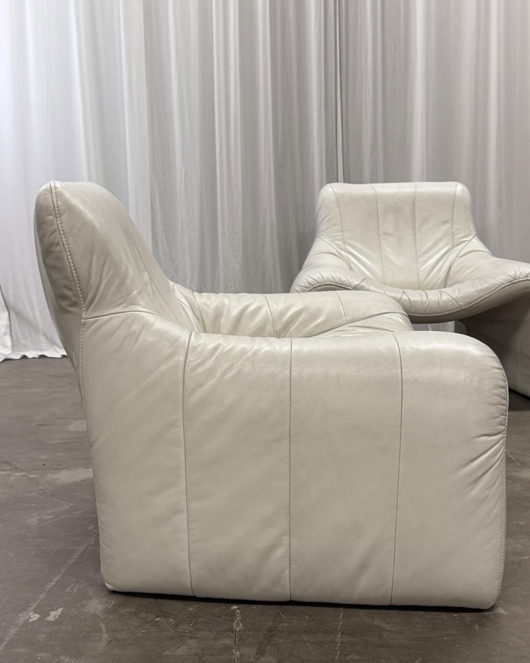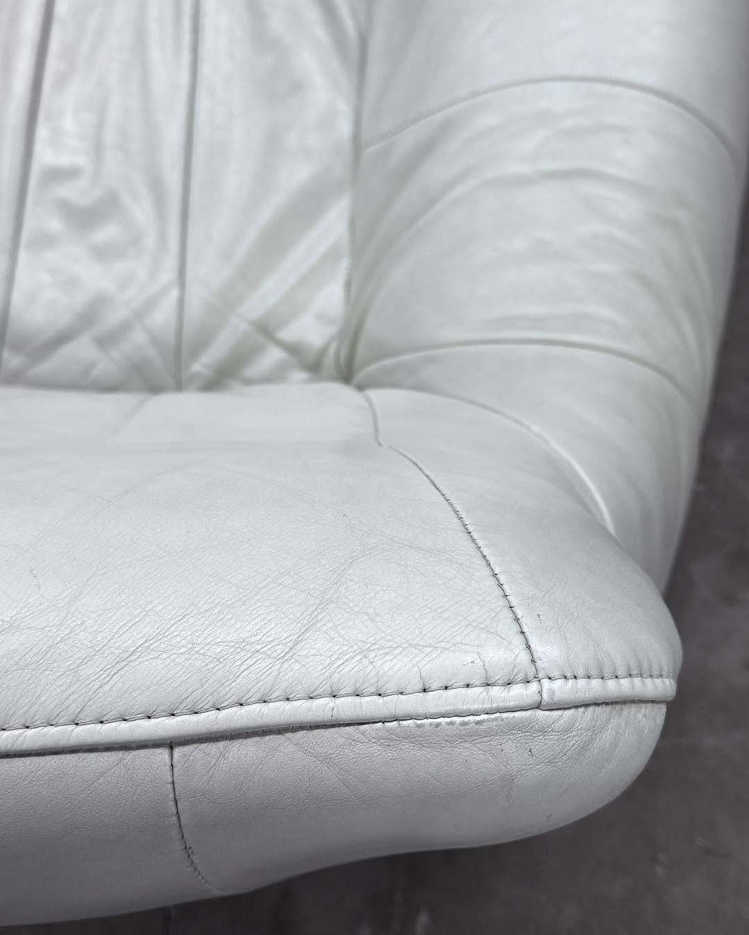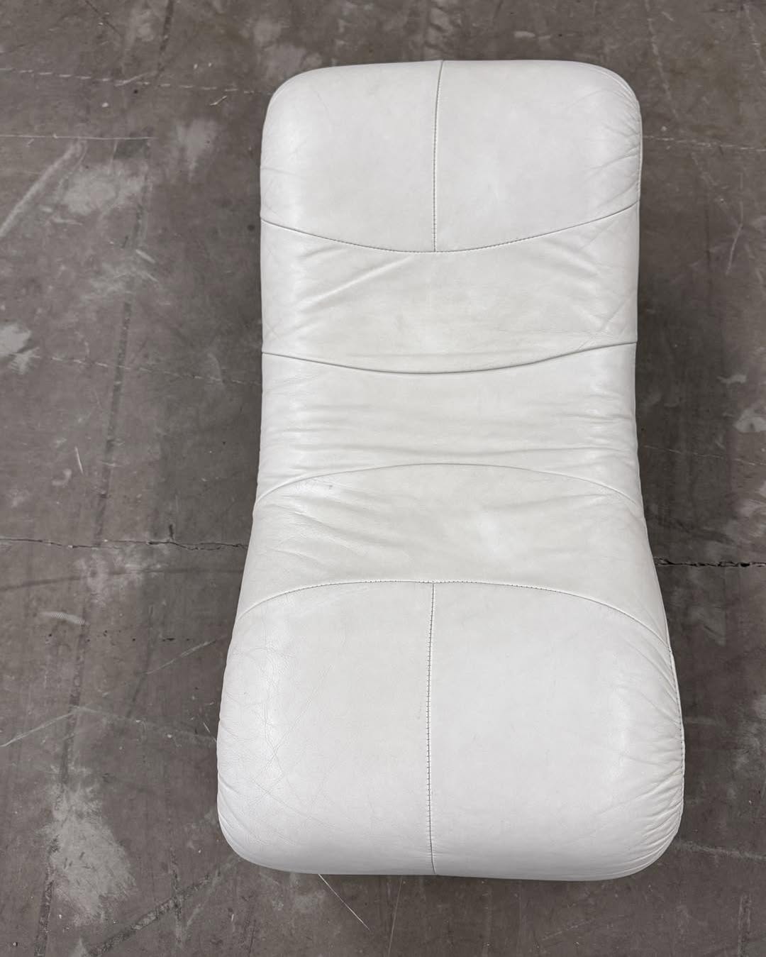 Zestaw — fotel i podnóżek ze skóry naturalnej w kolorze złamanej bieli. Świetna forma, mięciutka skóra. Projekt bez sygnatury.