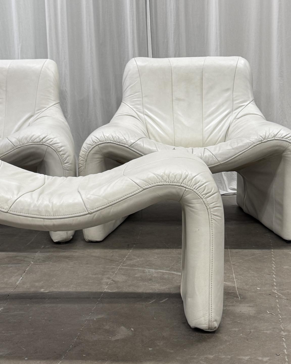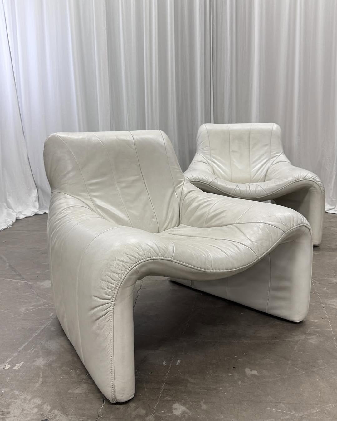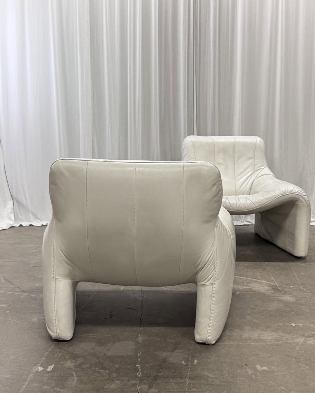 Zestaw — fotel i podnóżek ze skóry naturalnej w kolorze złamanej bieli. Świetna forma, mięciutka skóra. Projekt bez sygnatury.